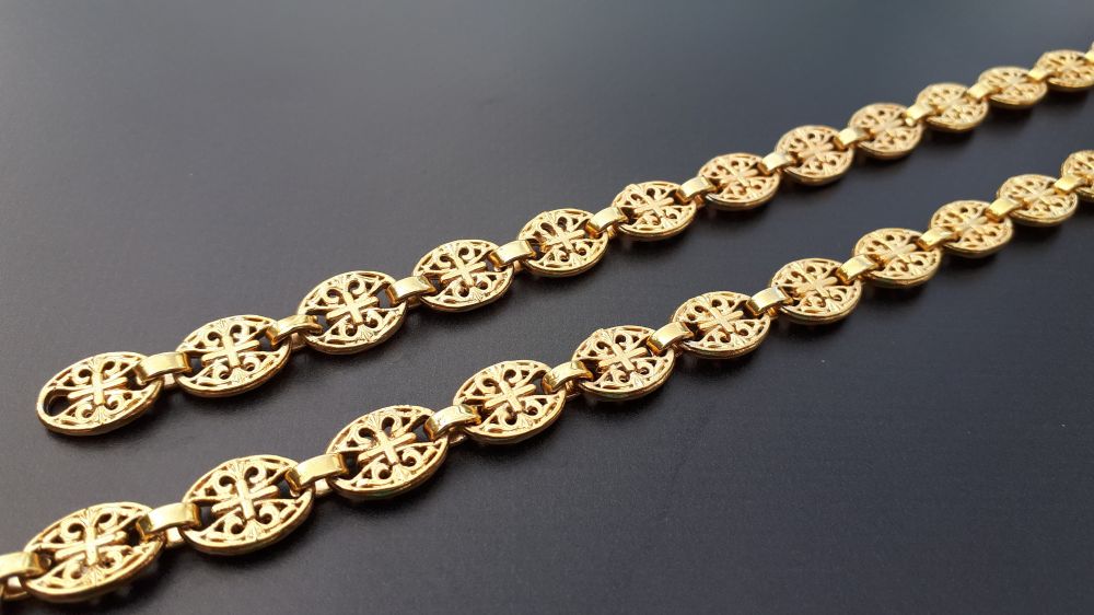 Цепь для наперсных крестов и панагий. Золочёная латунь. Вес - 133 г. Длина – 120 см., регулируемая по длине. Возможно серебрение цепи в латуни, изготовление цепи в серебре.