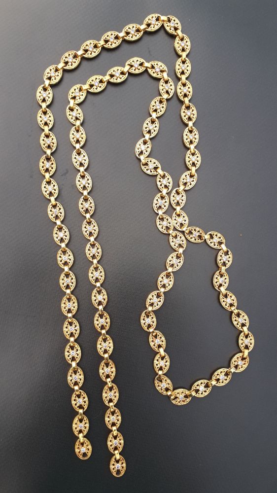 Ланцюг для наперсних хрестів та панагій. Позолочена латунь. Камені – цирконій. Вага – 127 г. Довжина – 120 см, регульована по довжині. Можливе посріблення ланцюга в латуні, виготовлення ланцюга в сріблі.