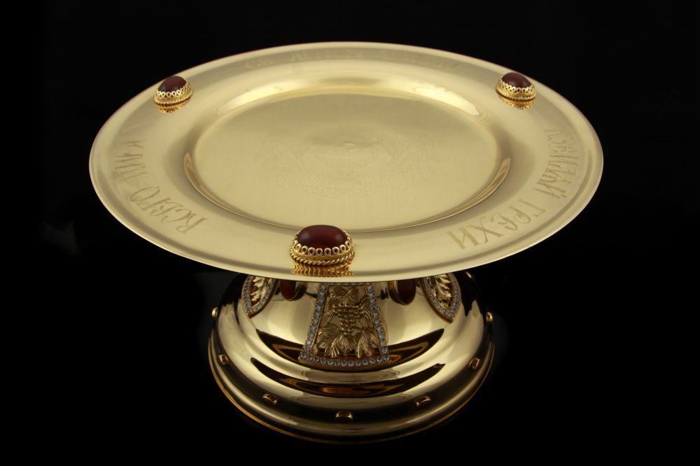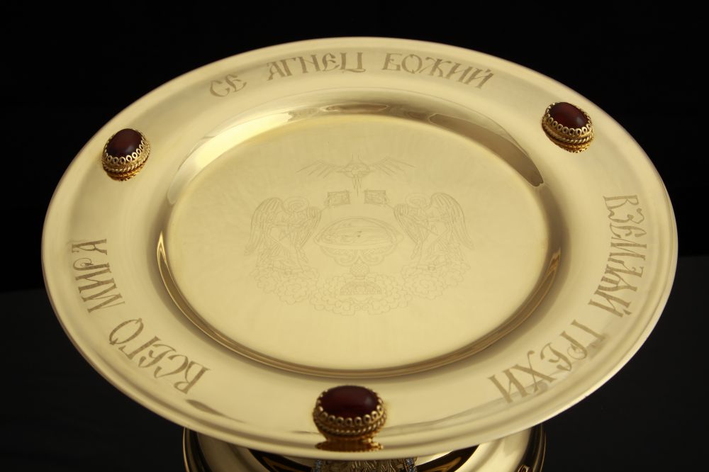 Дискос из золочёной латуни. Камни: натуральный сердолик. Вес в латуни: 960 г. Диаметр верхней части: 23,5 см. Возможна замена сердолика на натуральные нефрит, малахит, чароит, родонит, лазурит.
