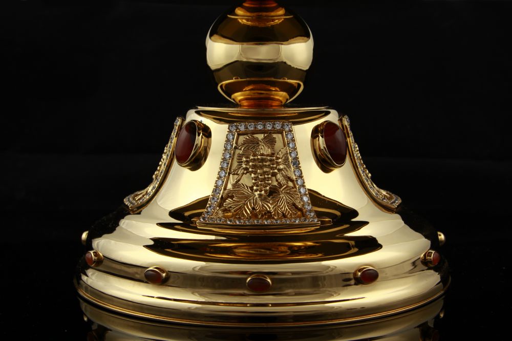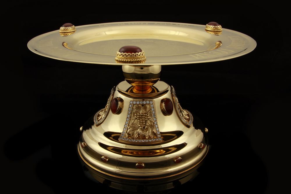 Дискос із золоченої латуні. Камені: натуральний сердолік. Вага у латуні: 960 г. Діаметр верхньої частини: 23,5 см. Можлива заміна сердоліку на натуральні нефрит, малахіт, чароїт, родоніт, лазурит. Можливе виготовлення дискосу зі срібла.