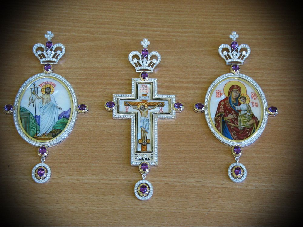 Комплект хрест і дві панагії. Малюнки - ручний розпис на перламутрі. Розміри хреста: 200х95 мм, вага 123 г. Розмір панагій: 180х95 мм, вага 96 г. Позолочена латунь. Камені – цирконій. Ланцюги та футляри в комплекті. Можлива зміна кольору каміння, малюнків, виготовлення виробів у сріблі.