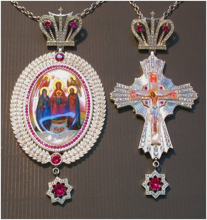 Комплект хрест і панагія. Малюнки - ручний розпис на перламутрі. Розміри хреста: 180х90 мм, вага 126 г. Розміри панагії: 180х90 мм, вага 152 г. Посріблена латунь. Камені – цирконій. Ланцюги та футляри в комплекті. Можлива зміна кольору каміння, малюнків, виготовлення виробів у сріблі.