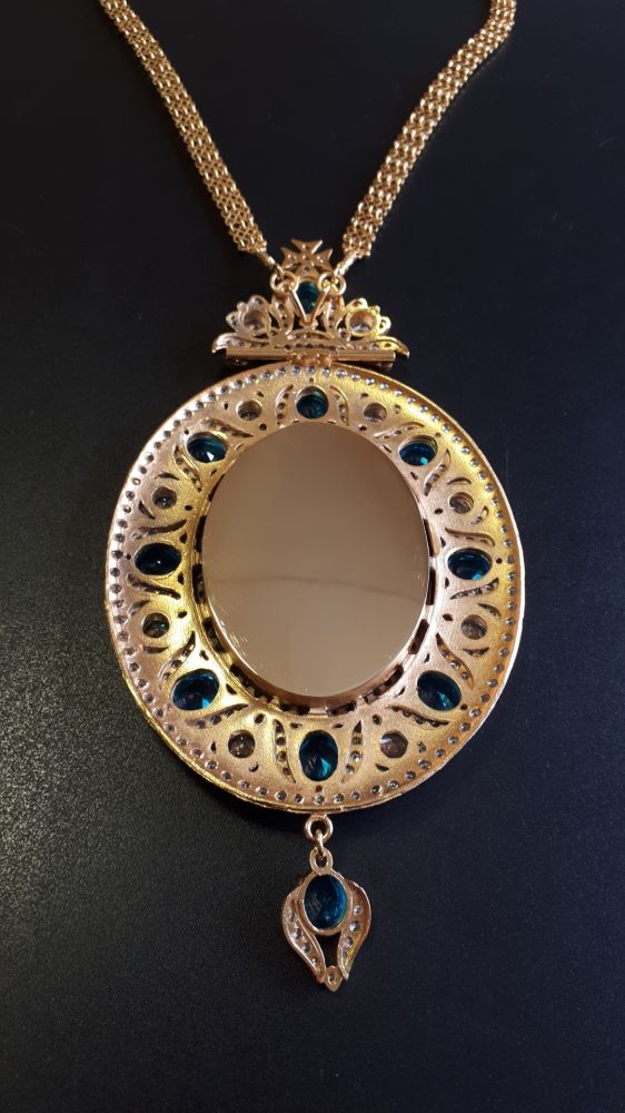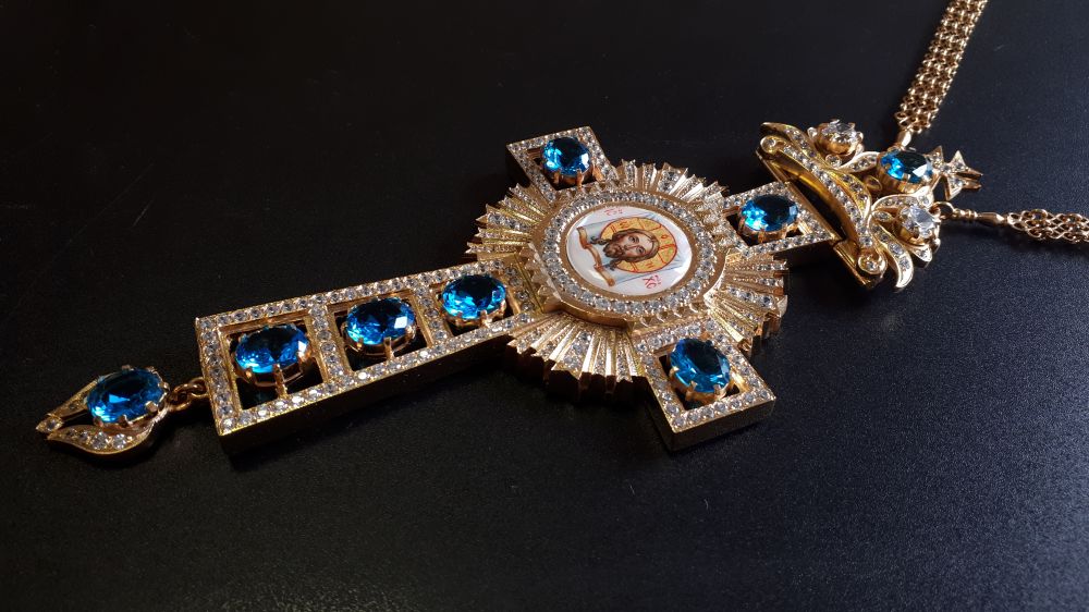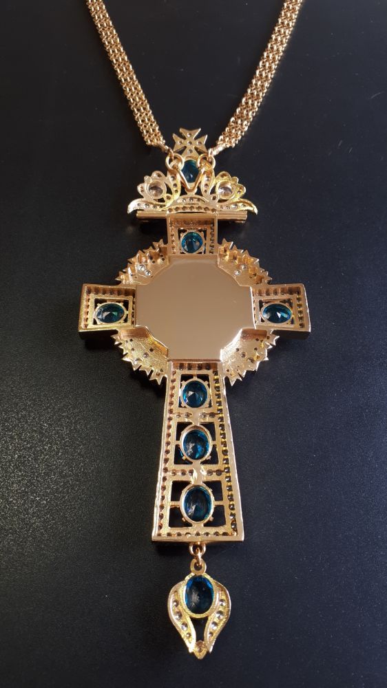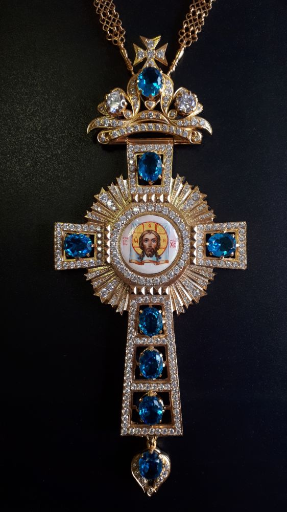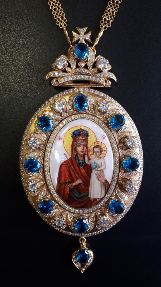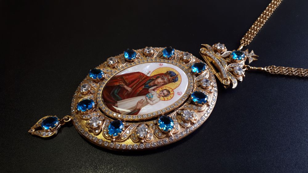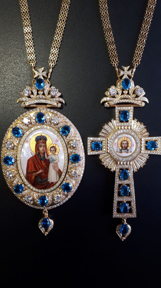 Комплект хрест і панагія. Малюнки - ручний розпис на перламутрі. Розміри хреста: 185х80 мм, вага 133 г. Розміри панагії: 185х92 мм, вага 187 г. Позолочена латунь. Камені – цирконій. Ланцюги та футляри в комплекті. Можлива зміна кольору каміння, малюнків, виготовлення виробів у сріблі.