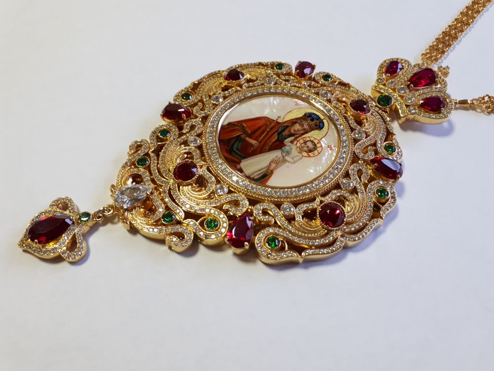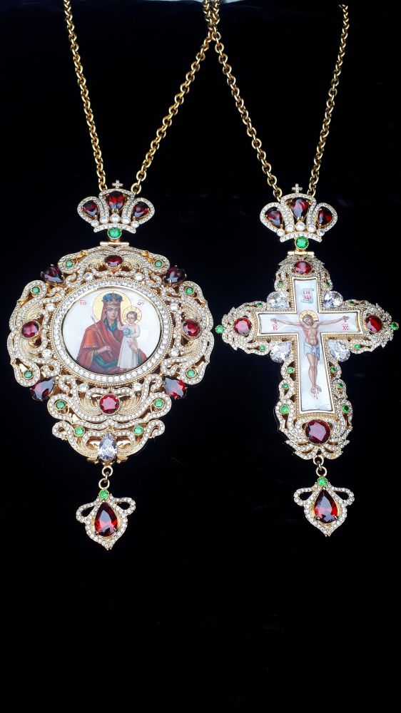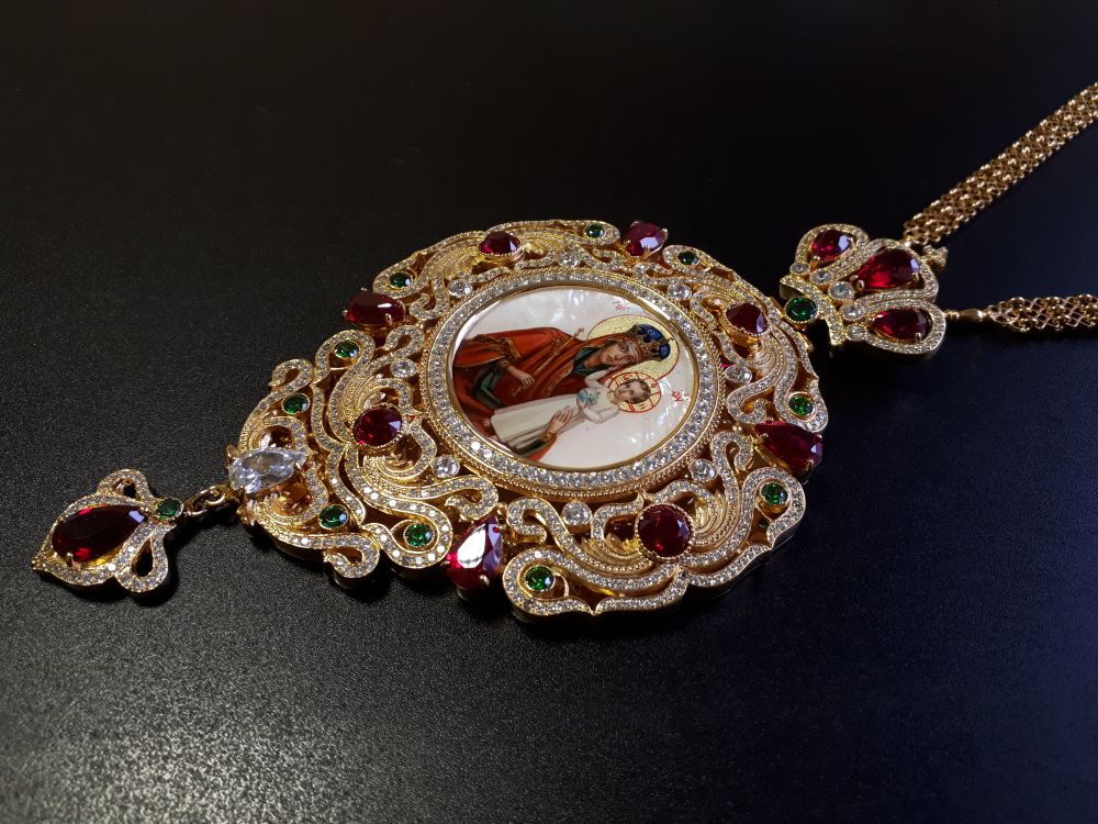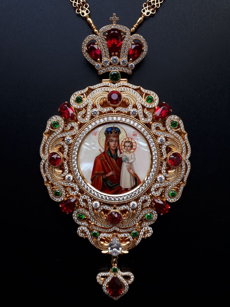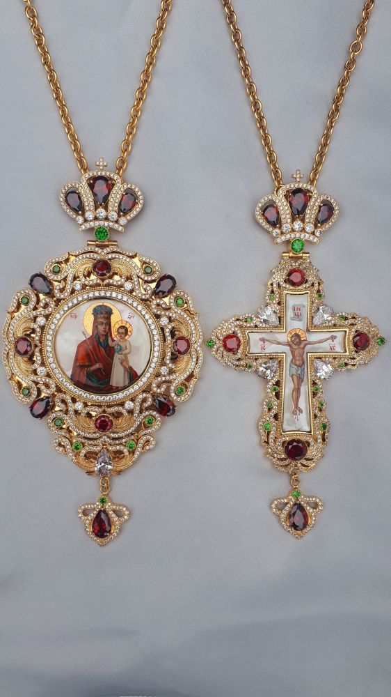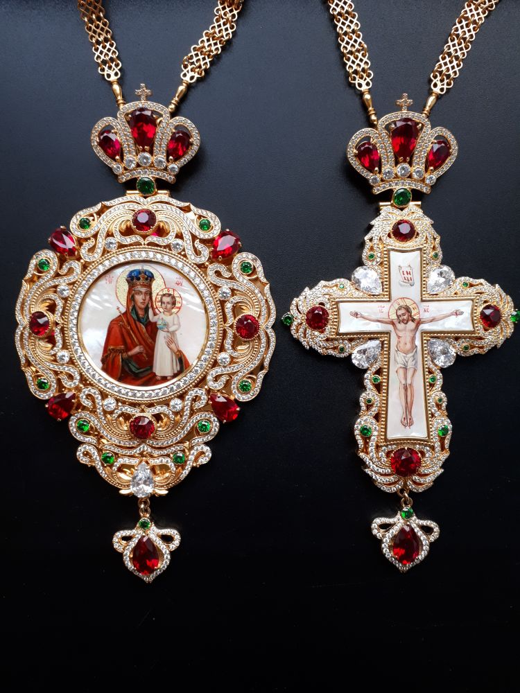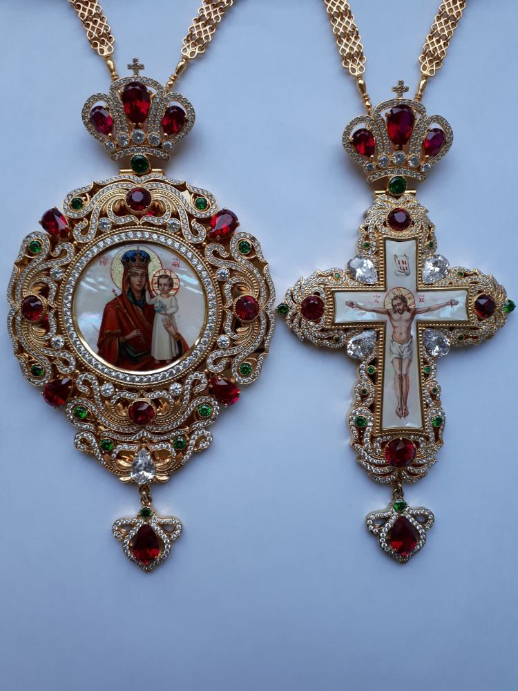Комплект хрест і панагія. Малюнки - ручний розпис на перламутрі. Розміри хреста: 165х80 мм, вага 122 г. Розміри панагії: 165х90 мм, вага 180 г. Позолочена латунь. Камені – цирконій. Ланцюги та футляри в комплекті. Можлива зміна кольору каміння, малюнків, виготовлення виробів у сріблі.