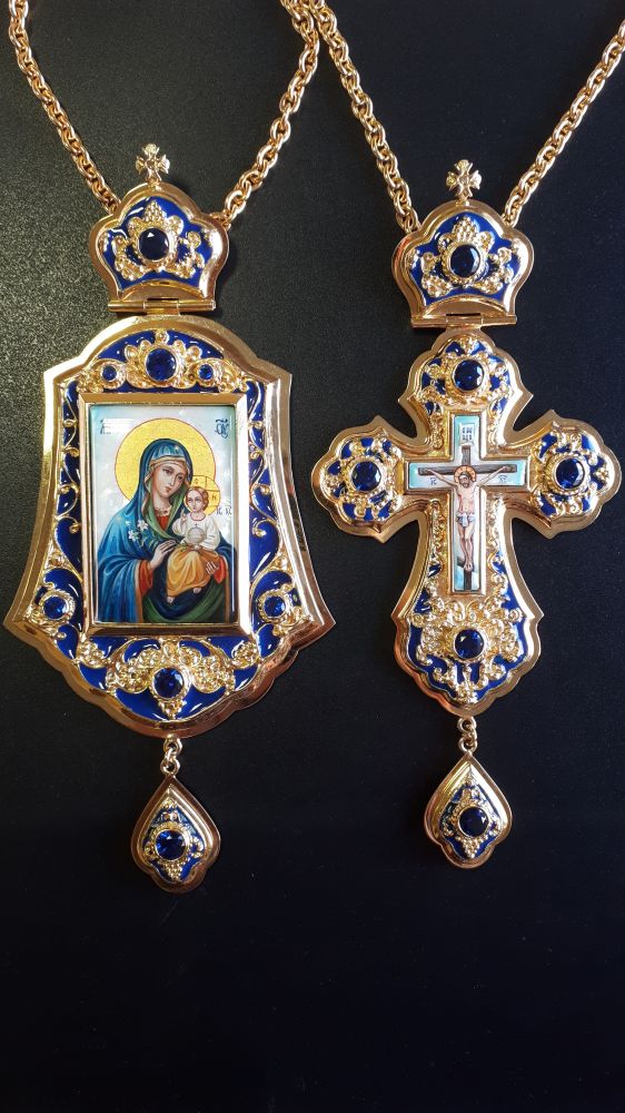 Комплект хрест і панагія. Малюнки - ручний розпис на перламутрі. Синя емаль. Розміри хреста: 185х80 мм, вага 146 г. Розмір панагії: 190х90 мм, вага 160 г. Позолочена латунь. Камені – цирконій. Ланцюги та футляри в комплекті. Можлива зміна кольору каміння, емалі, малюнків, виготовлення виробів у сріблі.