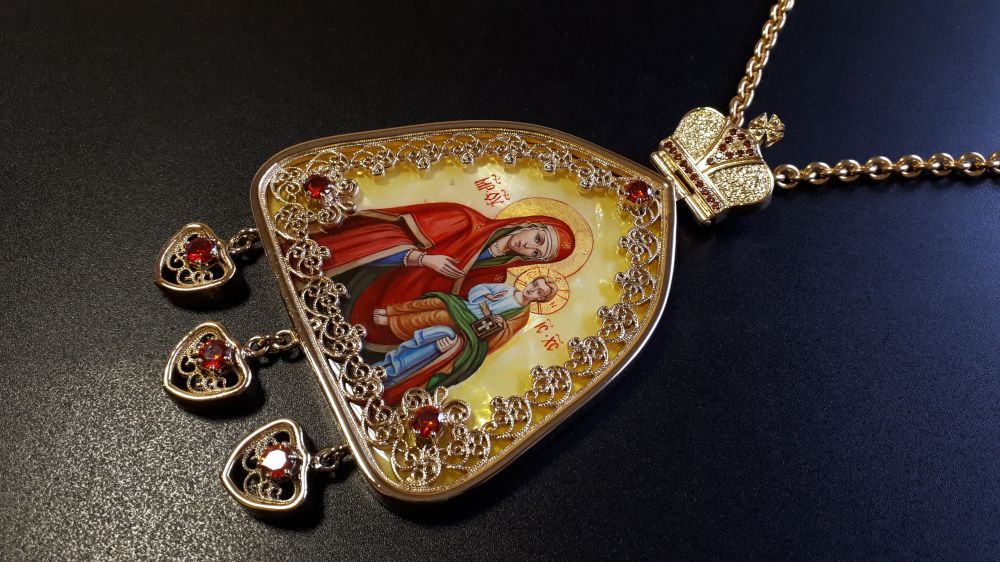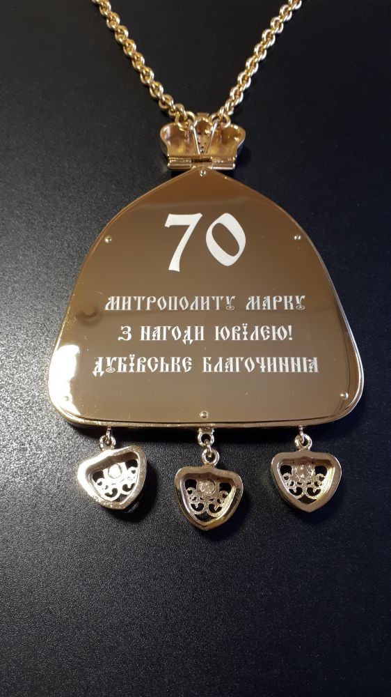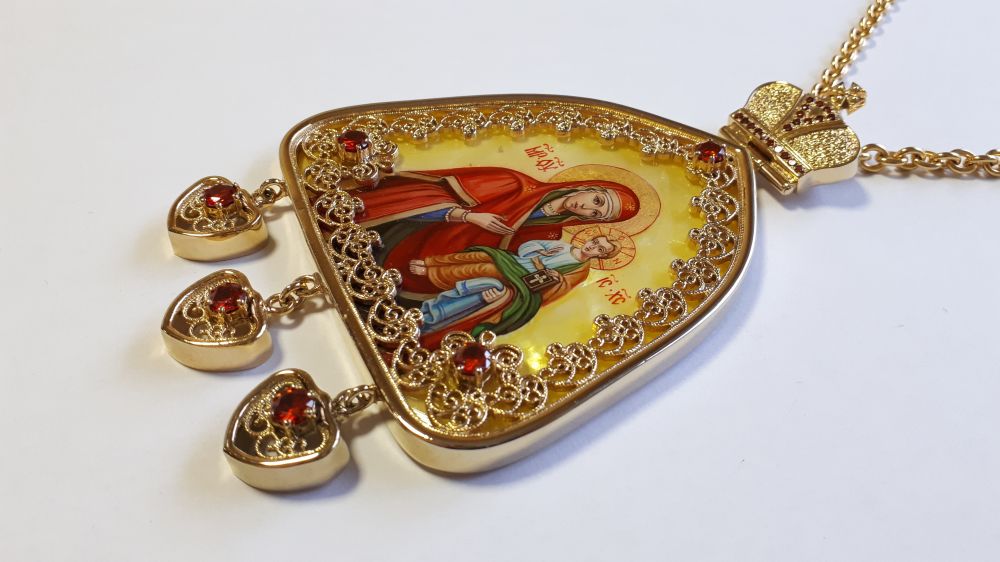 Комплект хрест і панагія. Малюнки - ручний розпис на перламутрі. Розміри хреста: 160х70 мм, вага 130 г. Розміри панагії: 145х90 мм, вага 145 г. Позолочена латунь. Камені – цирконій. Ланцюги та футляри в комплекті. Можлива зміна кольору каміння, малюнків, виготовлення виробів у сріблі.