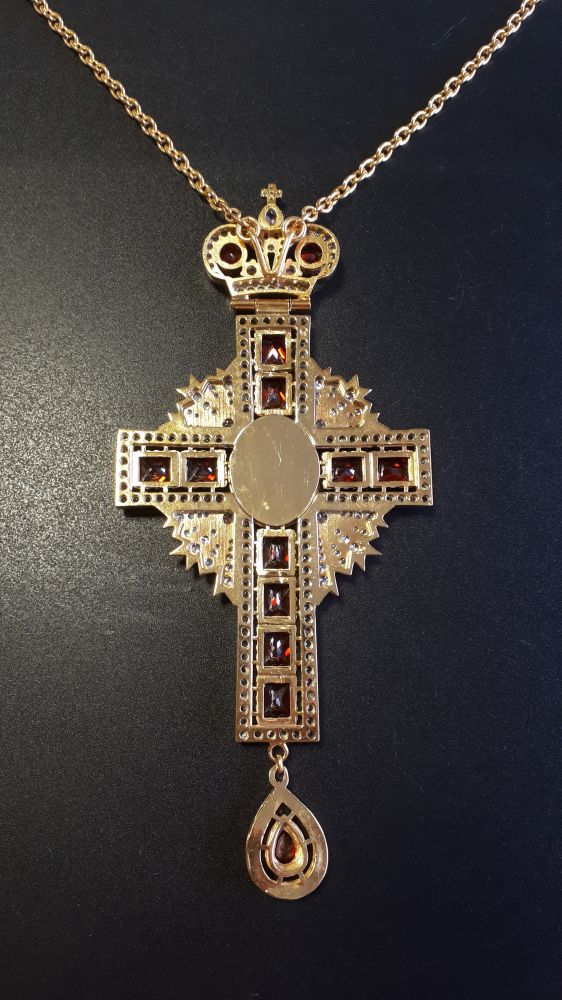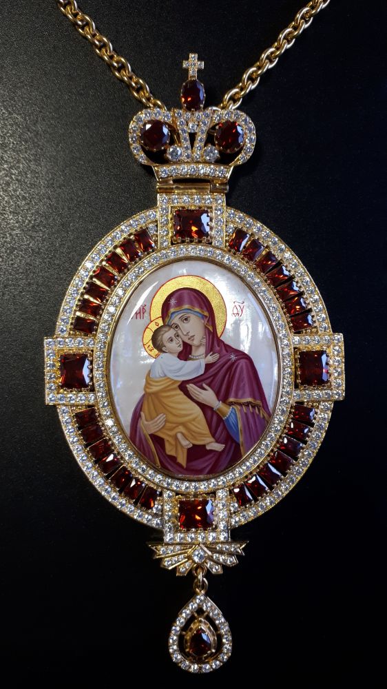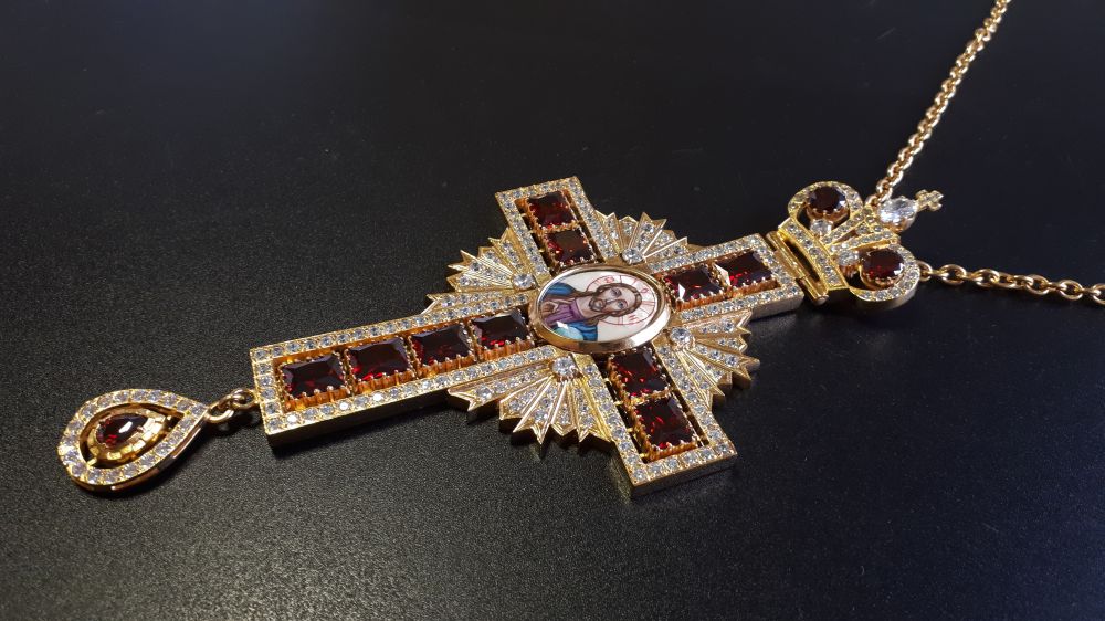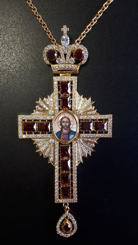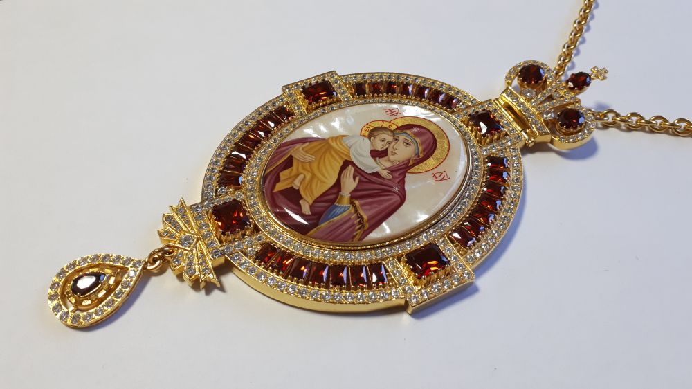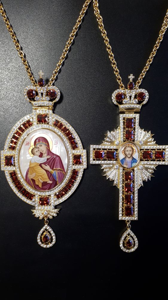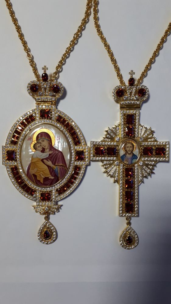 Комплект хрест і панагія. Малюнки - ручний розпис на перламутрі. Розміри хреста: 180х80 мм, вага 107 г. Розміри панагії: 176х85 мм, вага 112 г. Позолочена латунь. Камені – цирконій. Ланцюги та футляри в комплекті. Можлива зміна кольору каміння, малюнків, виготовлення виробів у сріблі.