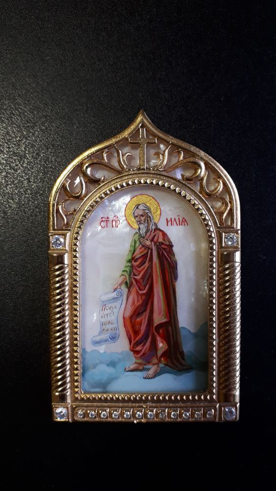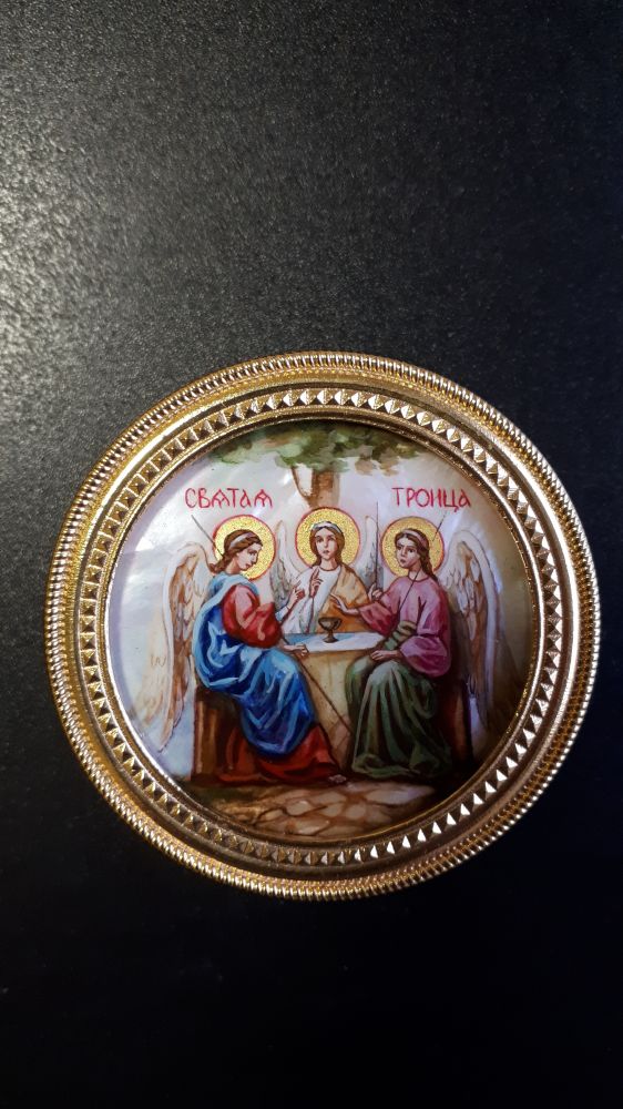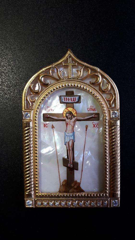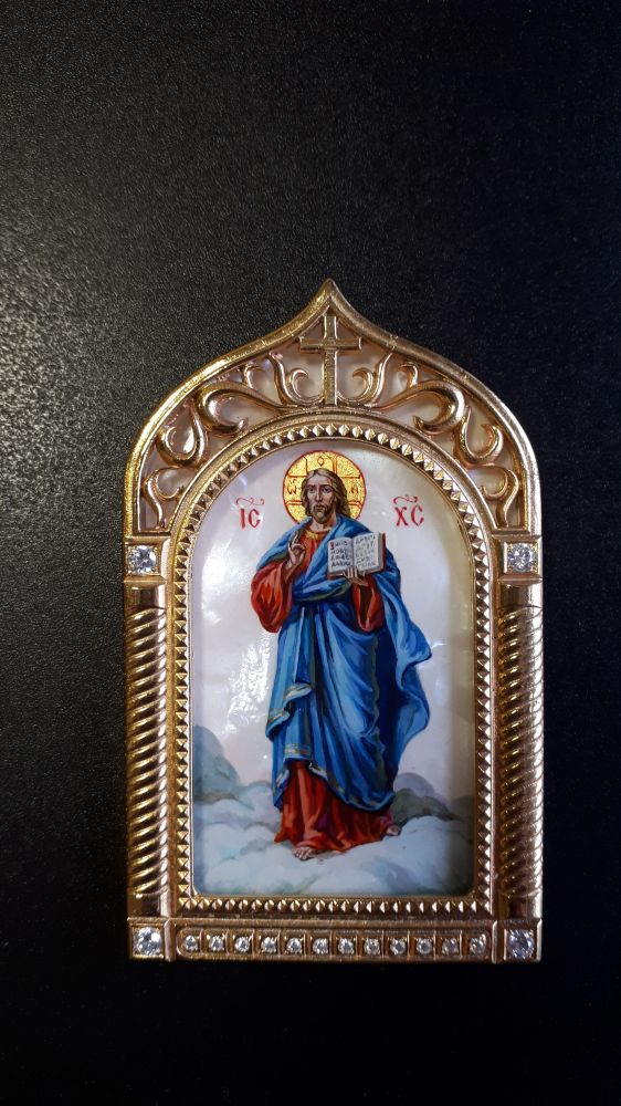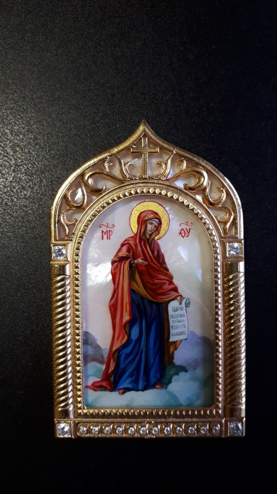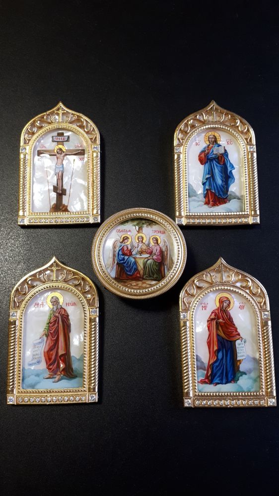 Комплект накладок на митру (5 штук) Рамки - золочёная латунь. Камни - цирконий. Рисунки - ручная роспись на перламутре, покрытая прозрачной эмалью. Возможно изменение рисунков, серебрение рамок, изменение цвета камней.Комплект накладок на митру (5 штук)