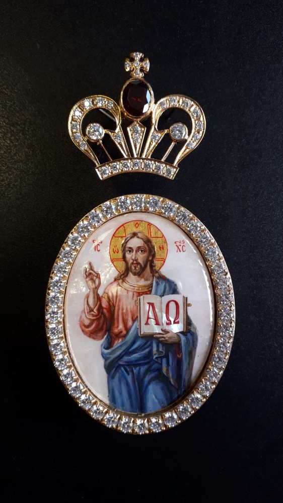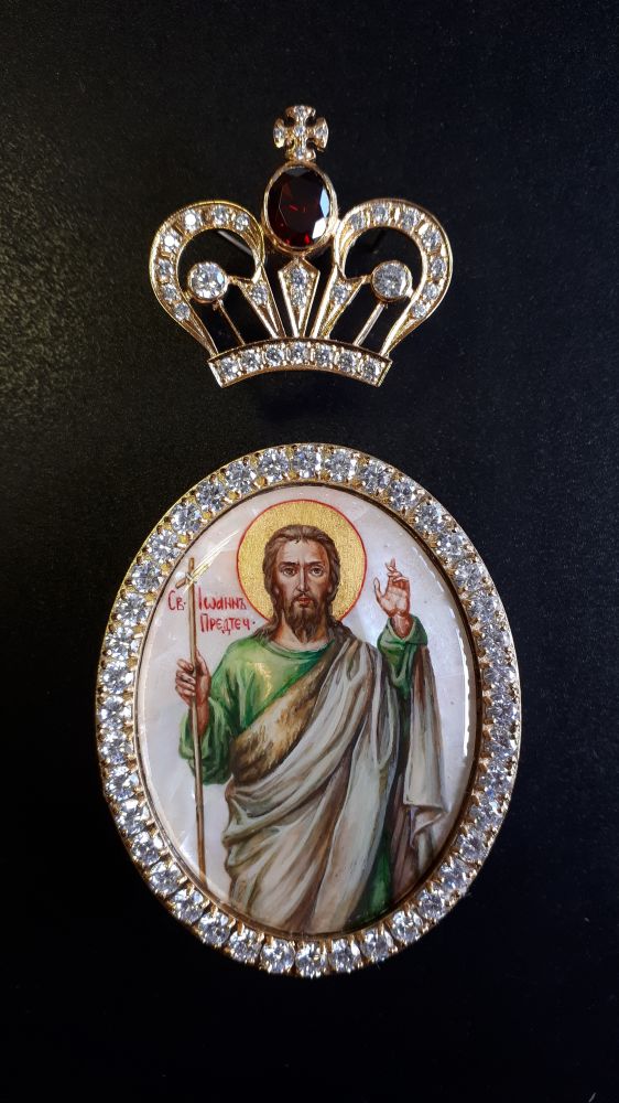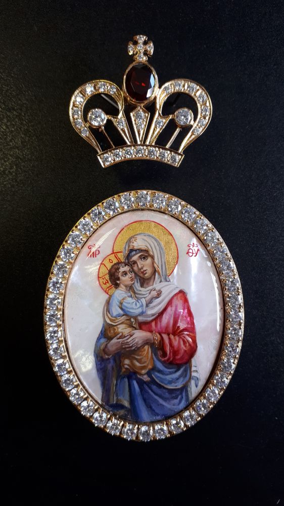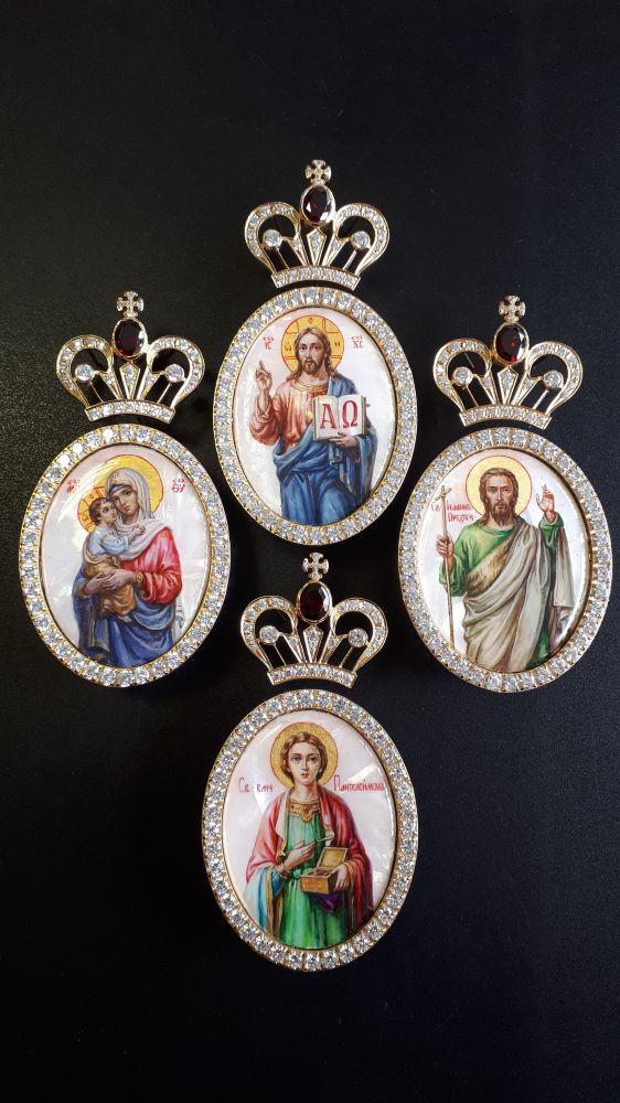 Комплект накладок на митру (4 штуки). Рамки - золочёная латунь. Камни - цирконий. Рисунки - ручная роспись на перламутре, покрытая прозрачной эмалью. Возможно изменение рисунков, серебрение рамок, изменение цвета камней.
