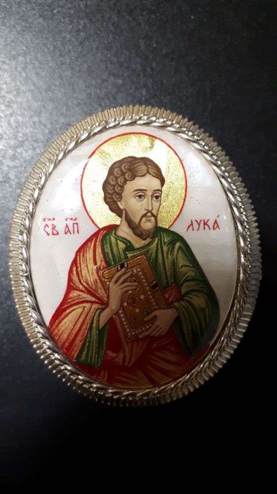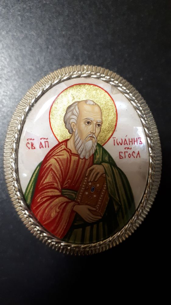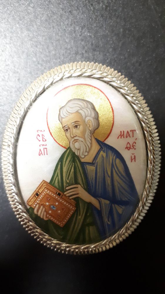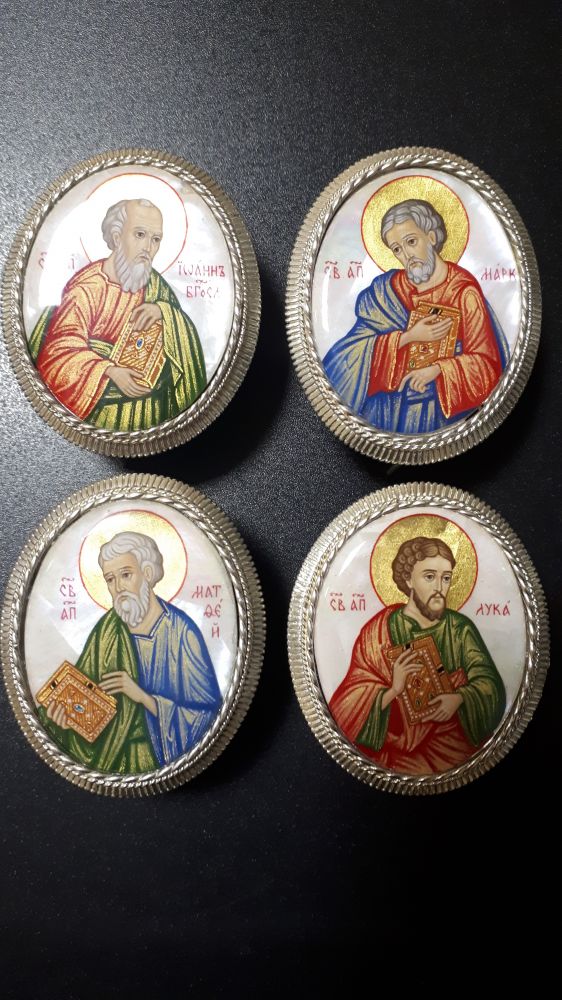 Комплект накладок на митру (4 штуки). Рамки - серебреная латунь. Рисунки - ручная роспись на перламутре, покрытая прозрачной эмалью. Возможно изменение рисунков, золочение рамок, изменение цвета камней.
