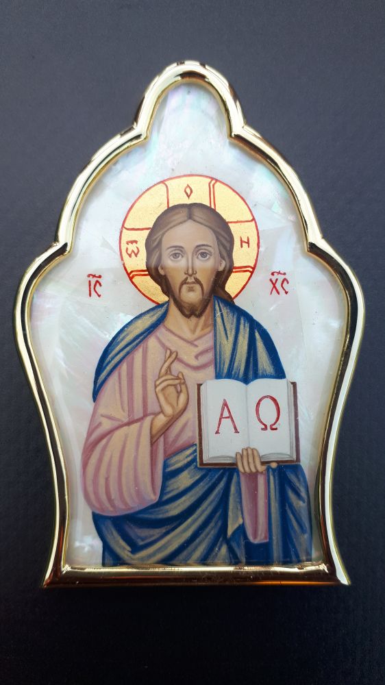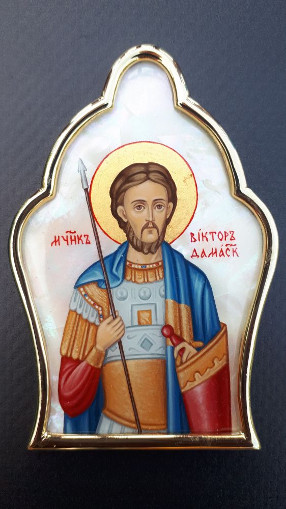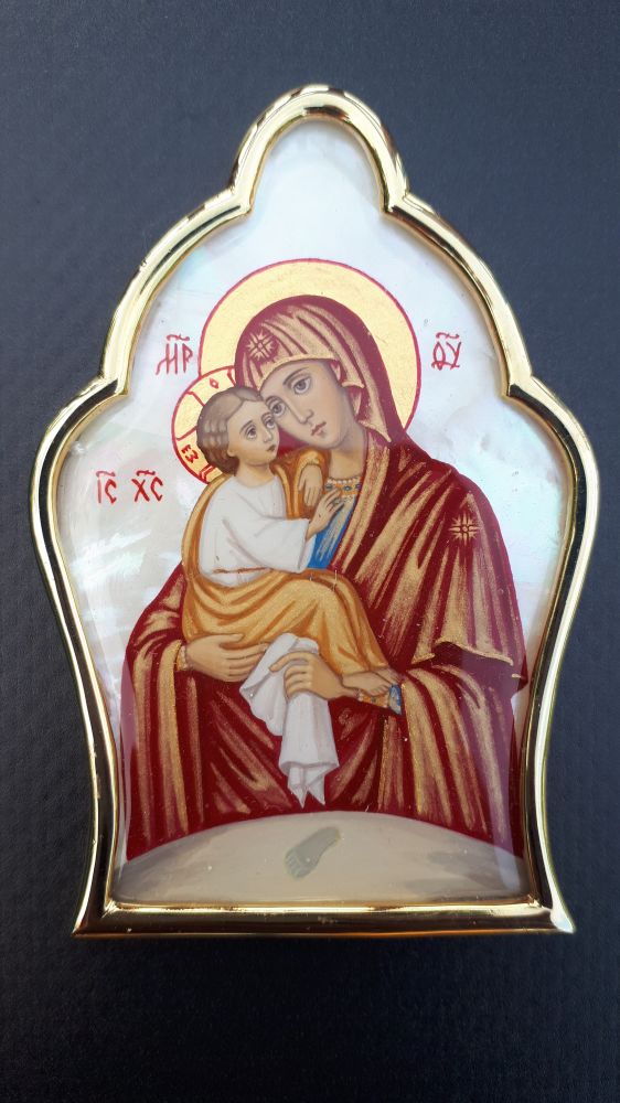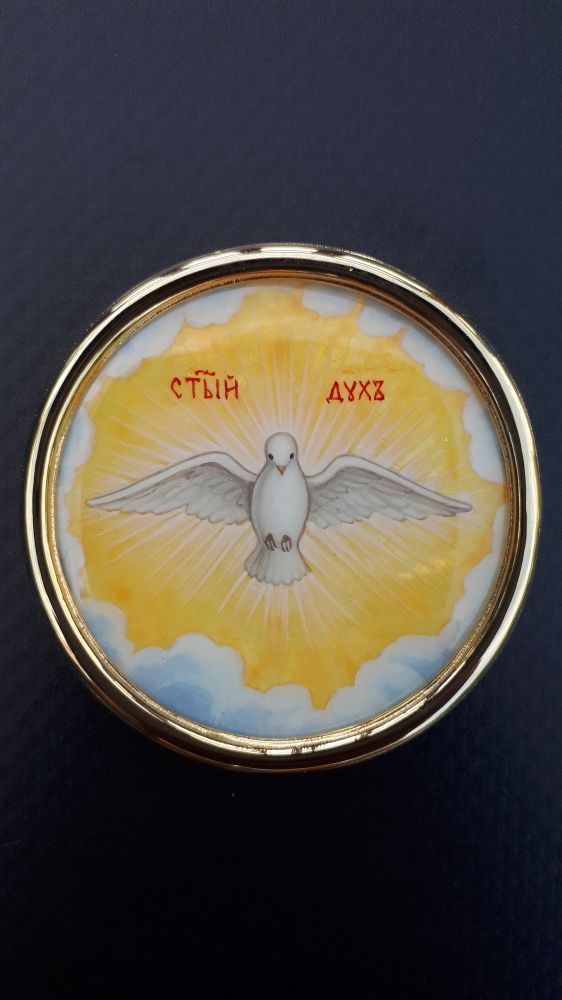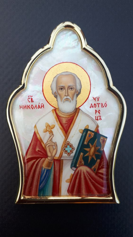Комплект накладок на митру (5 штук). Рамки - золочёная латунь. Рисунки - ручная роспись на перламутре, покрытая прозрачной эмалью. Возможно изменение рисунков, серебрение рамок.