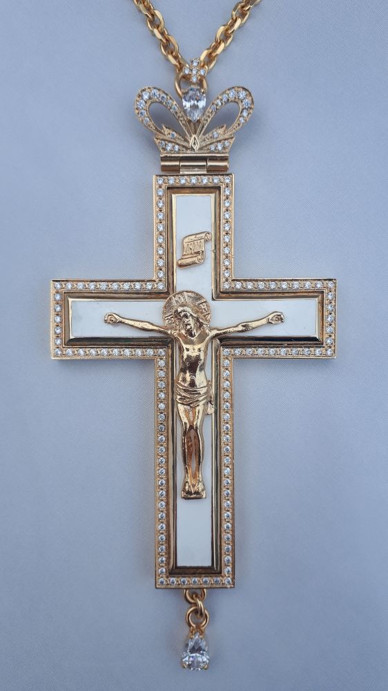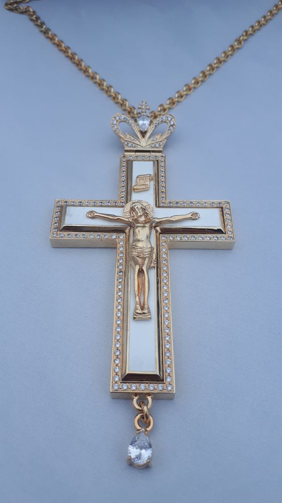 Крест кабинетный с белой эмалью. Литое распятие. Размеры: 120х65 мм. Вес: 70 г. Золоченая латунь. Камни - цирконий. Цепь и футляр в комплекте. Возможно изменение цвета камней, эмали, изготовление креста в серебре.