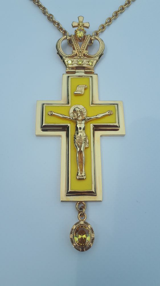 Хрест кабінетний Лите розп'яття, емаль Розміри: 135х52 мм Вага: 102 г Позолочена латунь. Камені – цирконій. Ланцюг та футляр у комплекті Можлива зміна кольору каміння, емалі, виготовлення хреста у сріблі.