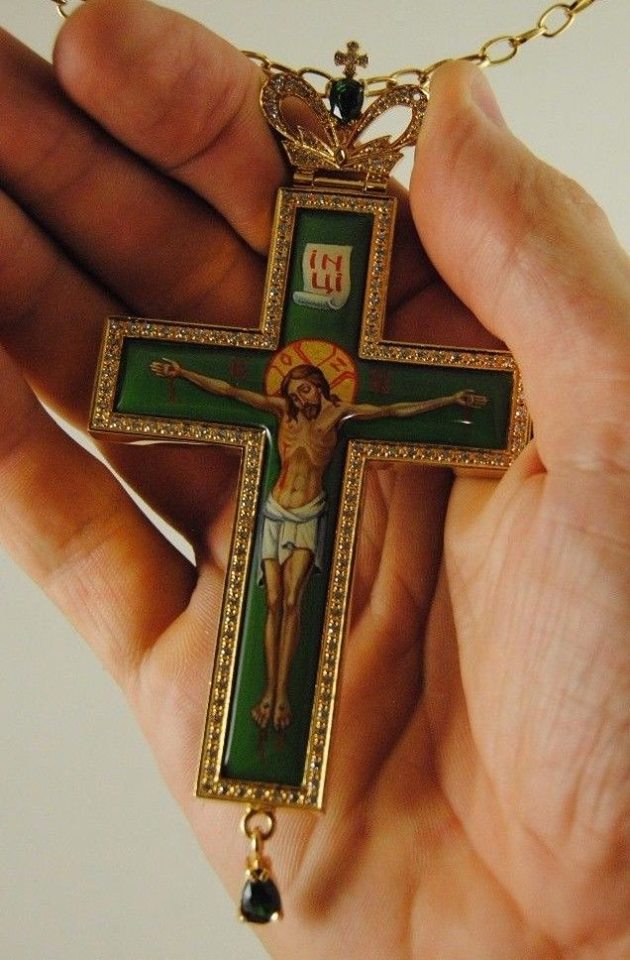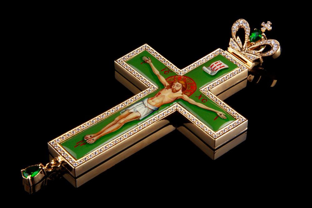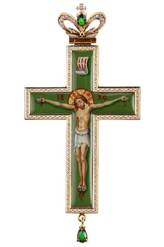 Хрест кабінетний Розп'яття - ручний розпис на металі. Розміри: 120х65 мм, Вага: 70 г Посріблена латунь. Камені – цирконій. Ланцюг та футляр у комплекті Можлива зміна кольору каміння, малюнка, виготовлення хреста у сріблі.