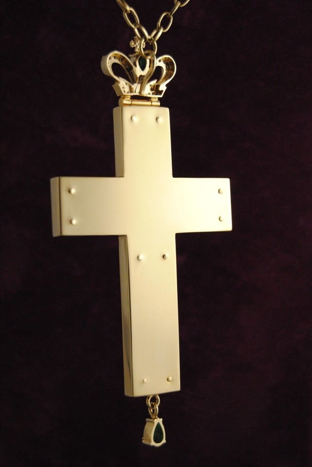 Крест кабинетный. Распятие - ручная роспись на металле. Размеры: 120х65 мм. Вес: 70 г. Золоченая латунь. Камни - цирконий. Цепь и футляр в комплекте. Возможно изменение цвета камней, рисунка, изготовление креста в серебре.Крест кабинетный.