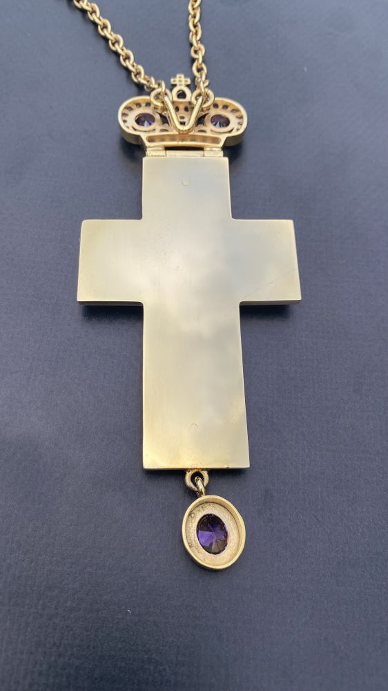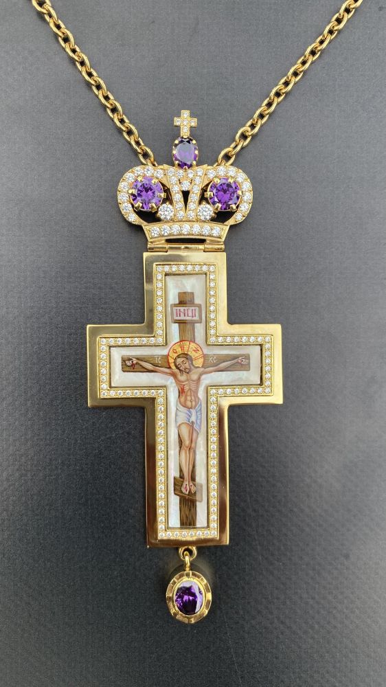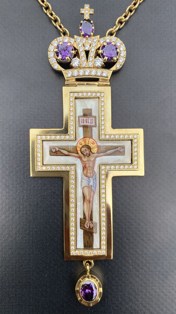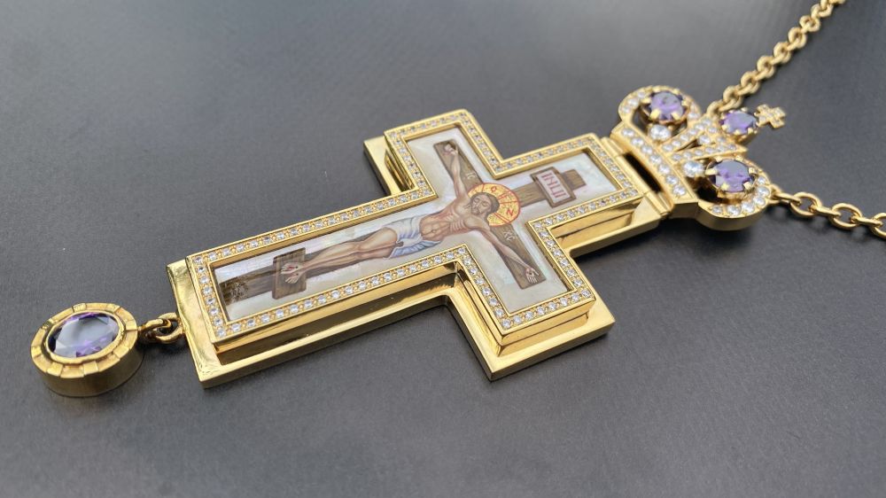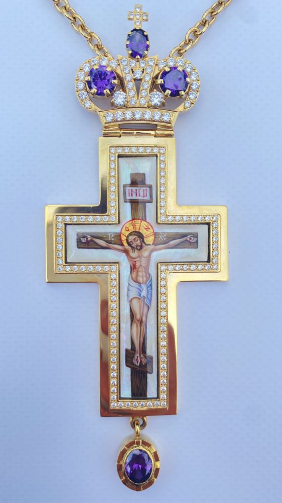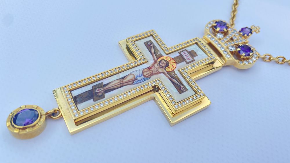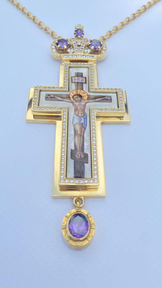 Хрест кабінетний Розп'яття - ручний розпис на перламутрі. Розміри: 135х52 мм Вага: 88 г Позолочена латунь. Камені – цирконій. Ланцюг та футляр у комплекті Можлива зміна кольору каміння, малюнка, виготовлення хреста у сріблі.