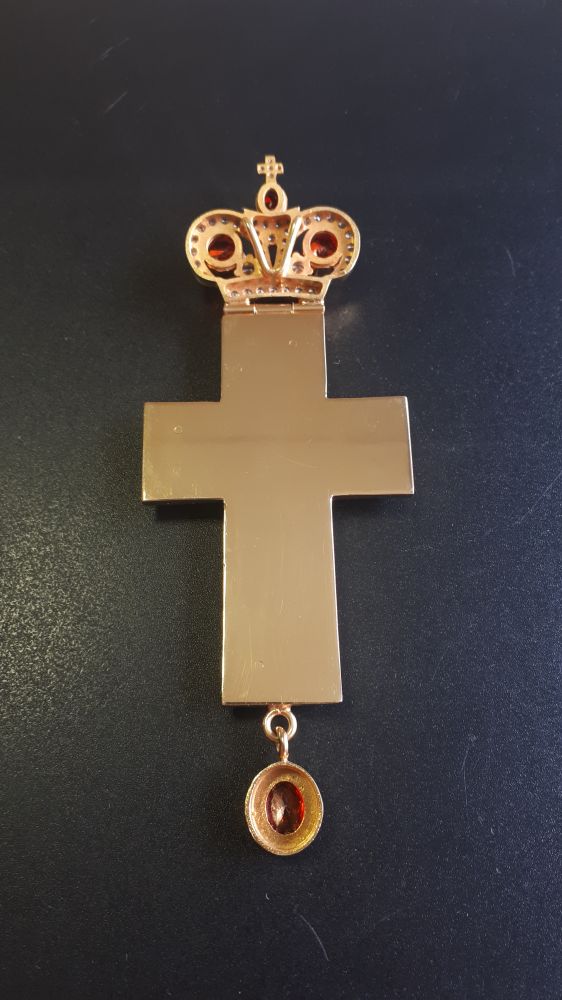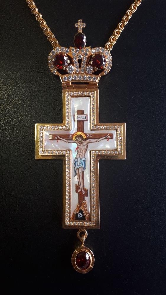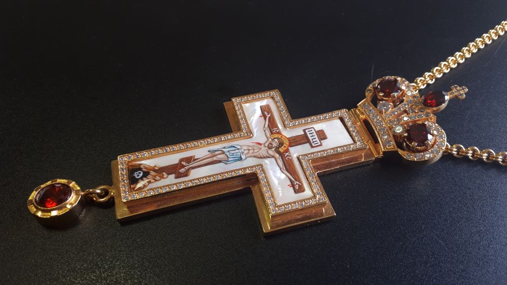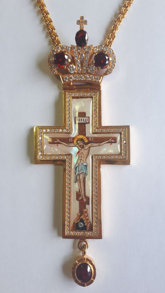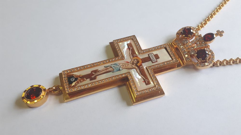Хрест кабінетний Розп'яття - ручний розпис на перламутрі. Розміри: 135х52 мм Вага: 88 г Позолочена латунь. Камені – цирконій. Ланцюг та футляр у комплекті Можлива зміна кольору каміння, малюнка, виготовлення хреста у сріблі.