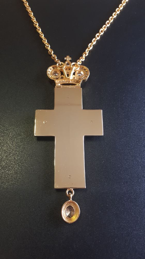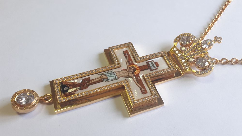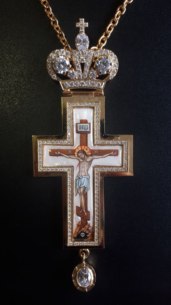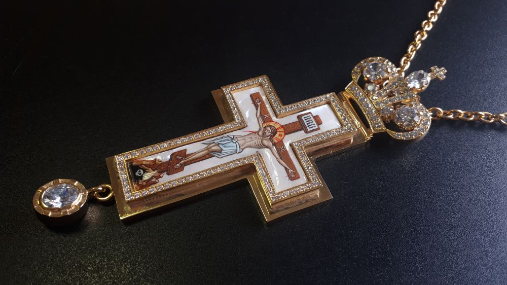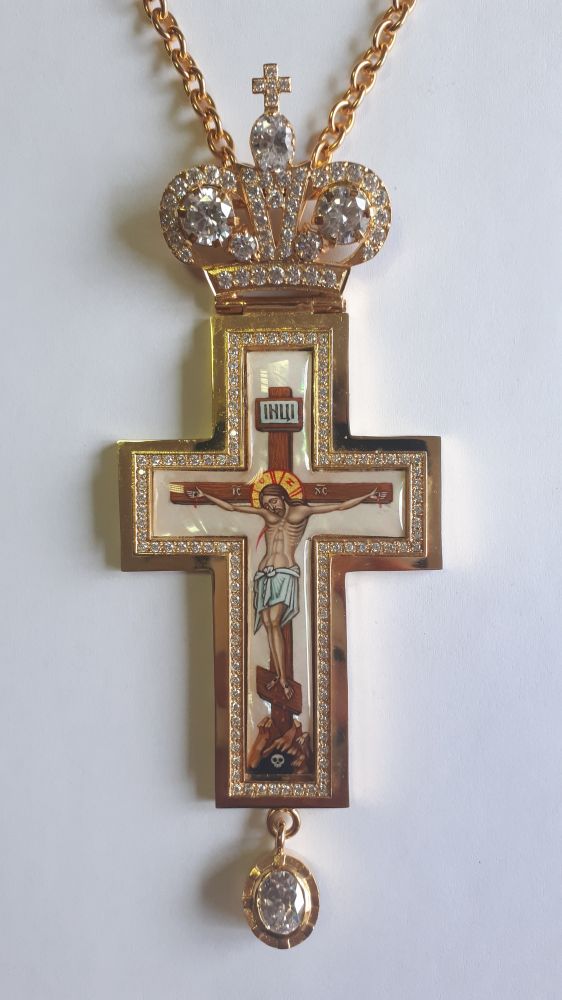 Хрест кабінетний Розп'яття - ручний розпис на перламутрі. Розміри: 135х52 мм Вага: 88 г Позолочена латунь. Камені – цирконій. Ланцюг та футляр у комплекті Можлива зміна кольору каміння, малюнка, виготовлення хреста у сріблі.