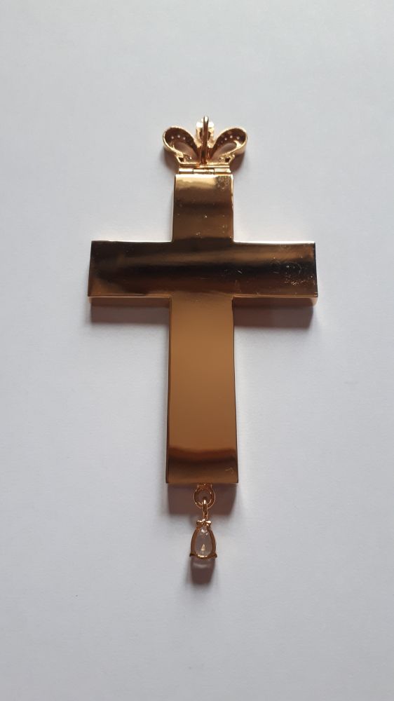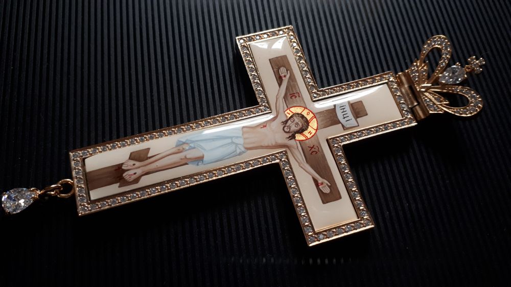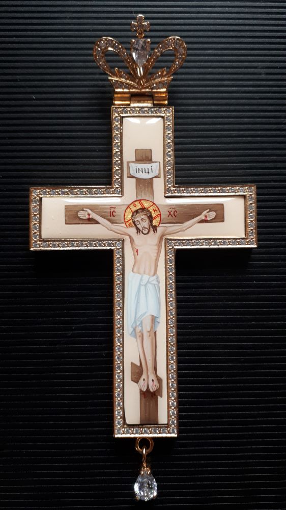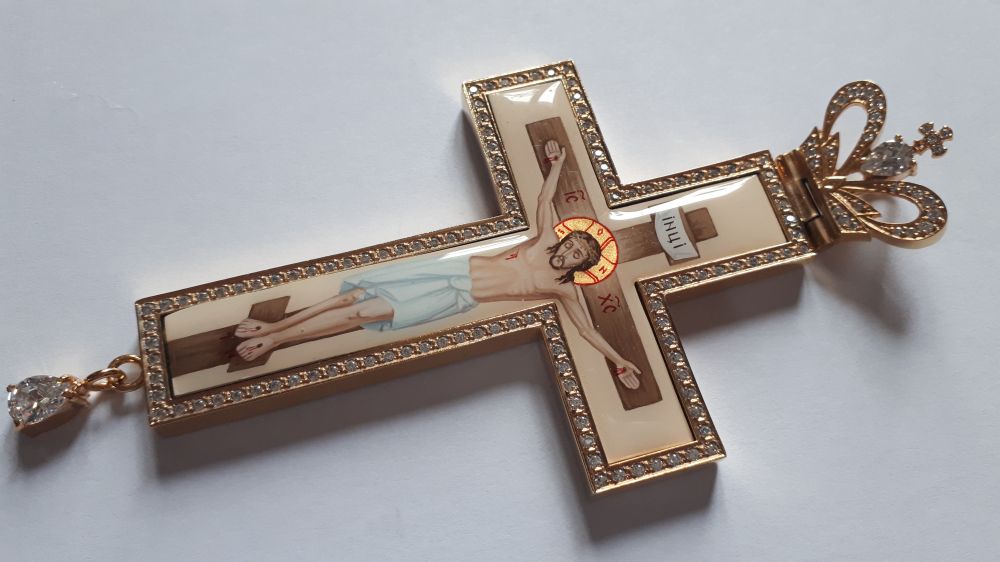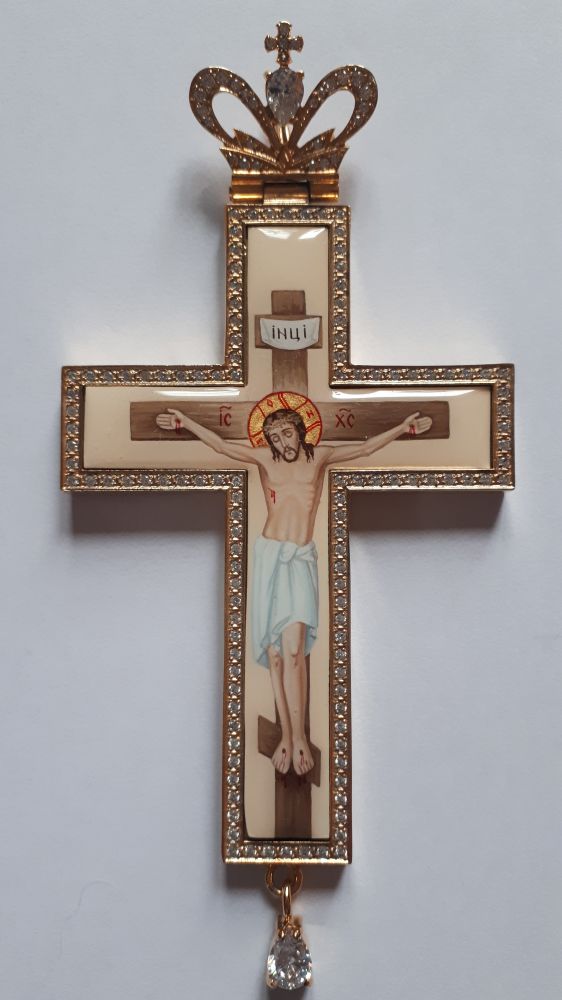 Хрест кабінетний. Розп'яття – ручний розпис на металі. Розміри: 120х65 мм. Вага: 70 г. Позолочена латунь. Камені – цирконій. Ланцюг та футляр у комплекті. Можлива зміна кольору каміння, малюнка, виготовлення хреста у сріблі.