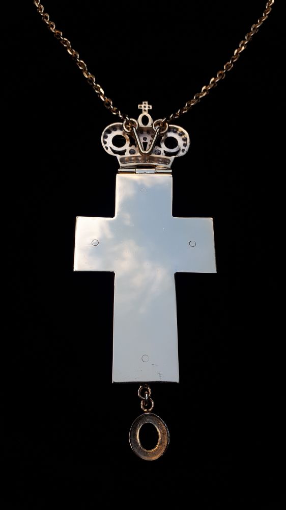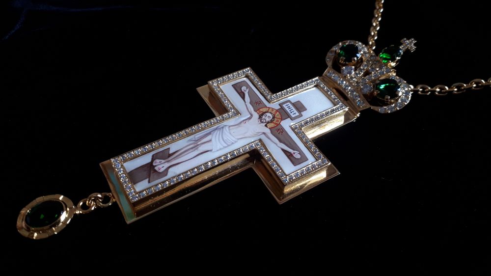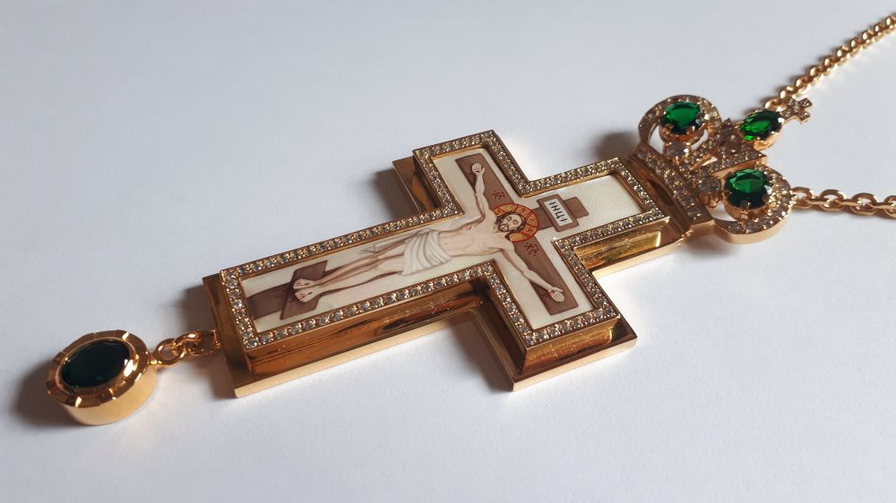 Хрест кабінетний Розп'яття - ручний розпис на перламутрі. Розміри: 135х52 мм Вага: 88 г Позолочена латунь. Камені – цирконій. Ланцюг та футляр у комплекті Можлива зміна кольору каміння, малюнка, виготовлення хреста у сріблі.