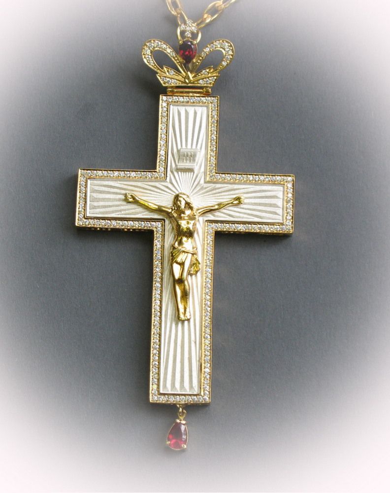 Хрест кабінетний. Лите розп'яття. Розміри: 120х65 мм. Вага: 70 г. Позолочена та посріблена латунь. Камені – цирконій. Ланцюг та футляр у комплекті. Можлива зміна кольору каміння, виготовлення хреста у сріблі.