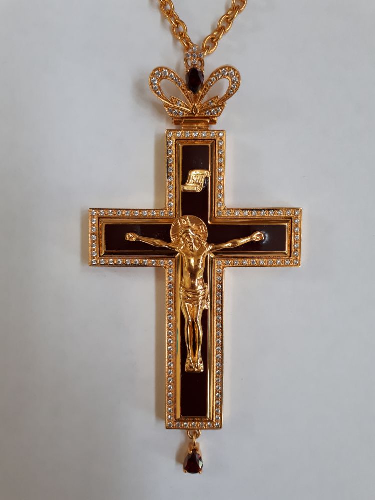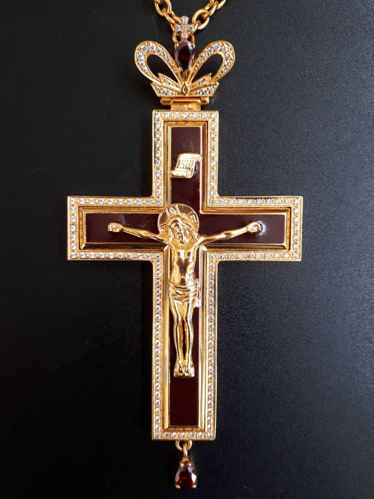 Хрест кабінетний з бордовою емаллю. Лите розп'яття. Розміри: 120х65 мм. Вага: 70 г. Позолочена латунь. Камені – цирконій. Ланцюг та футляр у комплекті. Можлива зміна кольору каміння, емалі, виготовлення хреста у сріблі.