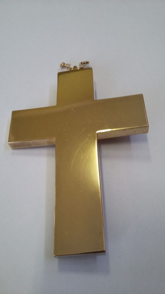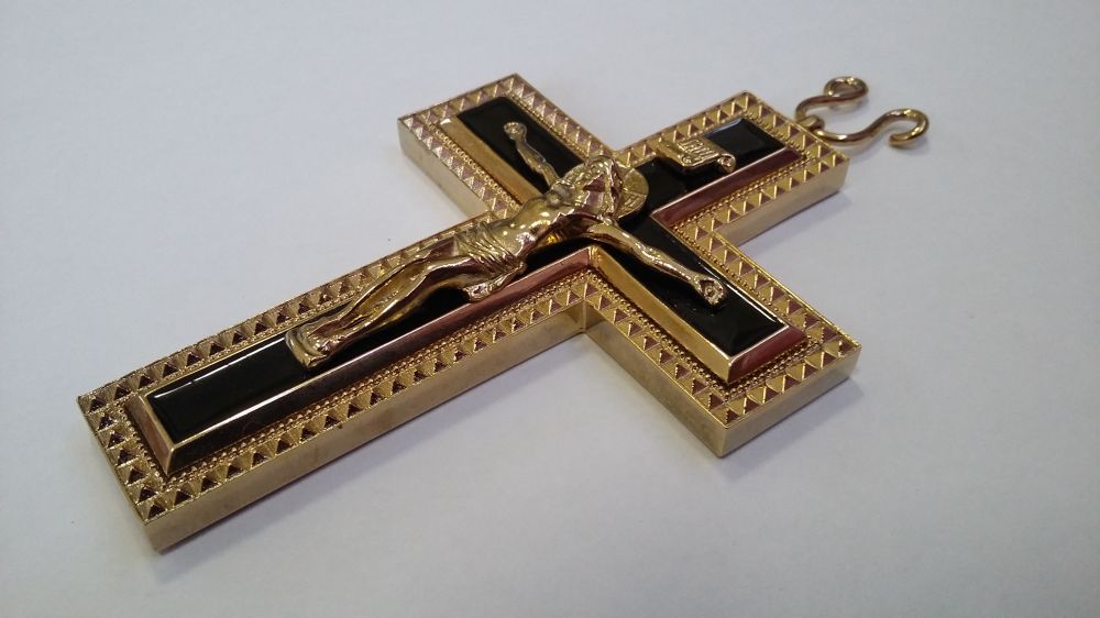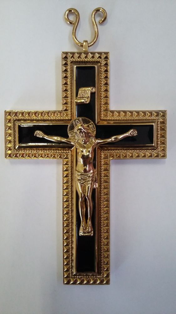 Хрест кабінетний. Лите розп'яття. Чорна емаль. Розміри: 100х70 мм. Вага: 75 г. Позолочена латунь. Ланцюг та футляр у комплекті. Можлива зміна кольору емалі, виготовлення хреста у сріблі.
