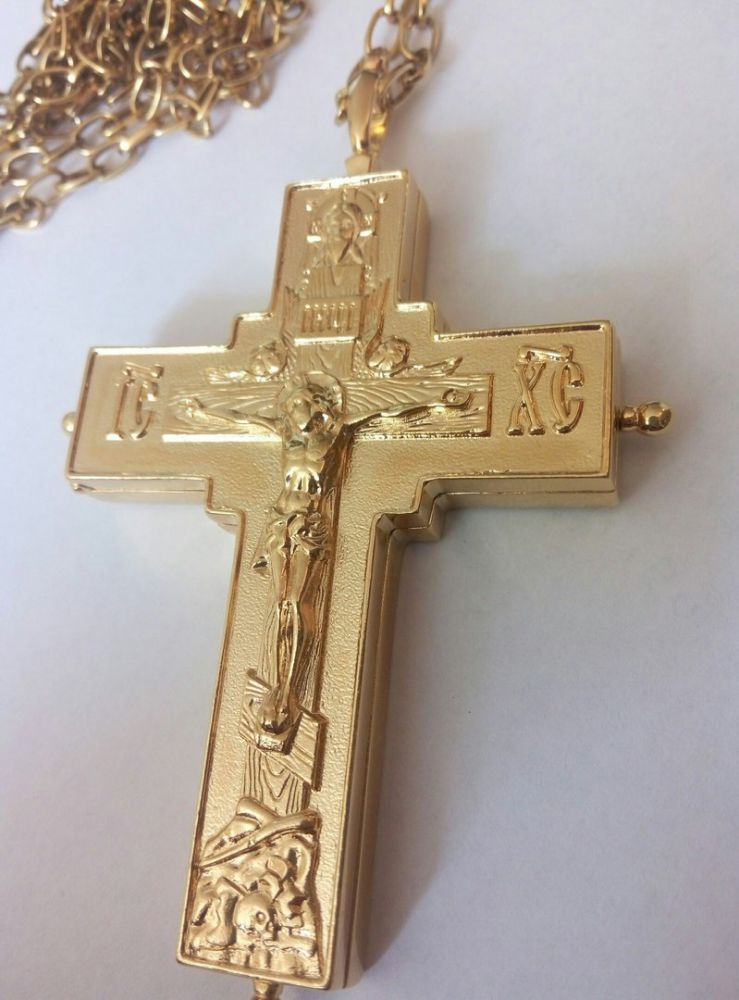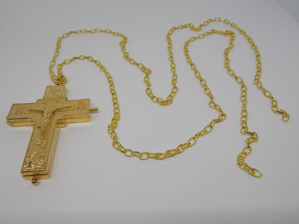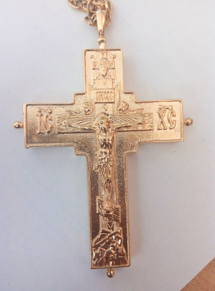 Крест- мощевик золочёный. Литое распятие. Размеры: 95х60 мм. Вес: 60 г. Золоченая латунь. Цепь и футляр в комплекте. Возможно изготовление креста в серебре.Крест- мощевик золочёный.
