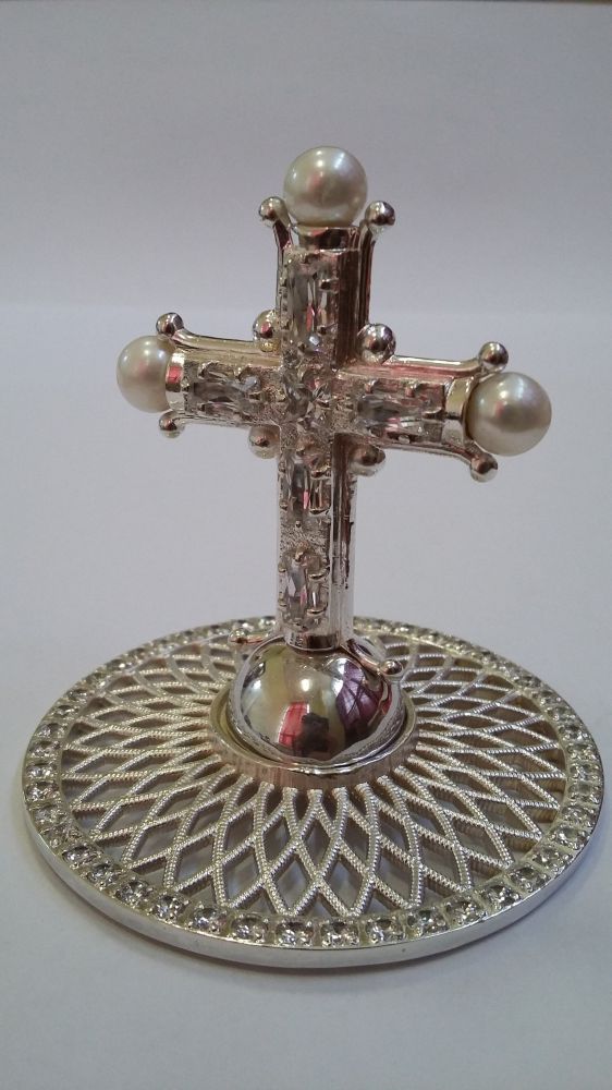 Крест на митру. Серебрёная латунь. Камни – цирконий. Натуральный жемчуг. Возможно изменение цвета камней. Замена серебрения на золочение.