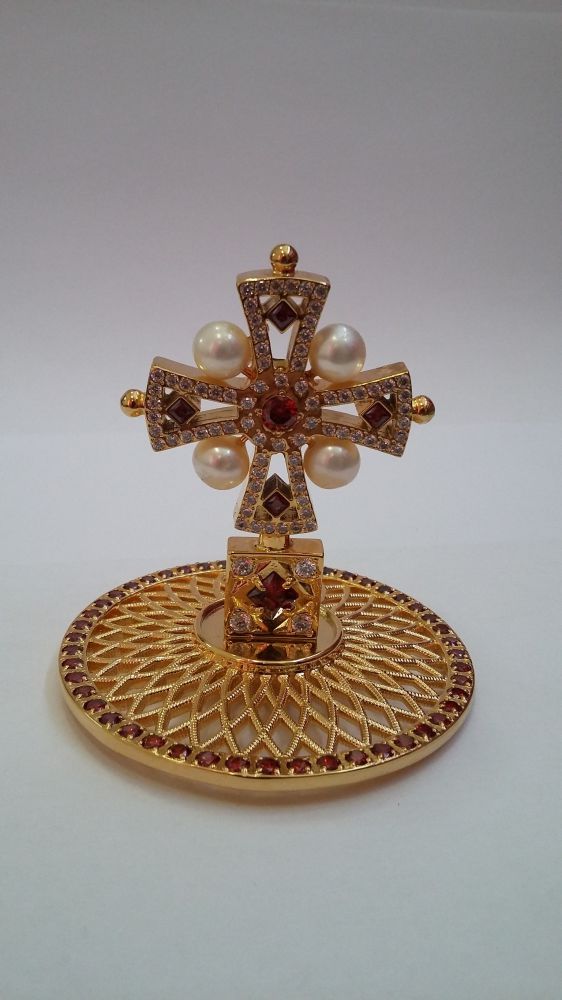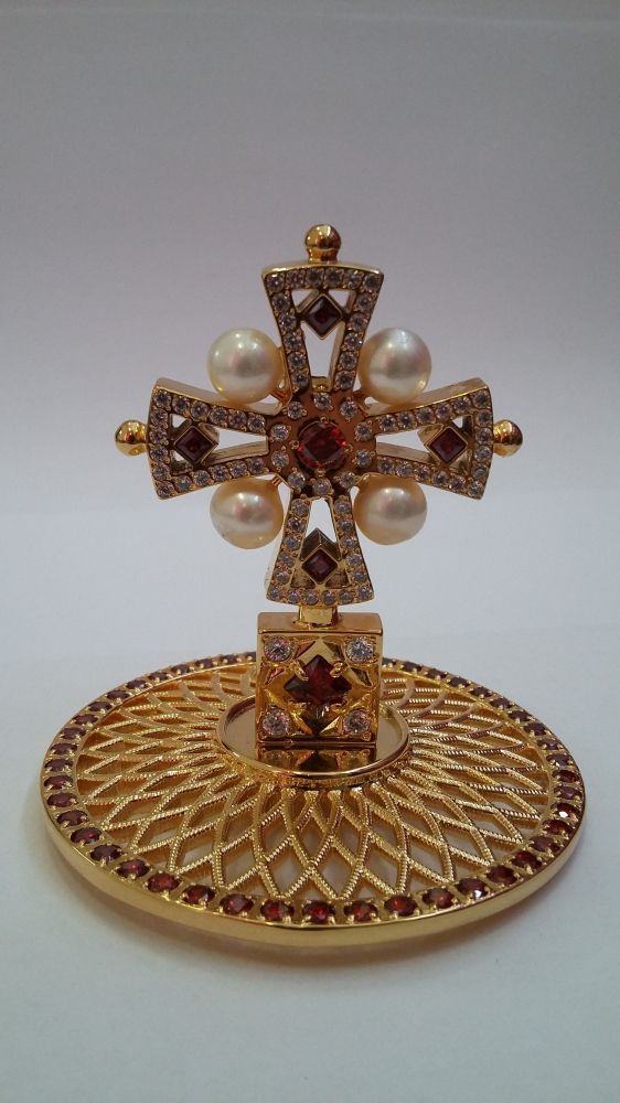 Хрест на митру. Позолочена латунь. Камені – цирконій. Натуральні перли. Можлива зміна кольору каміння. Заміна позолочення на посріблення.