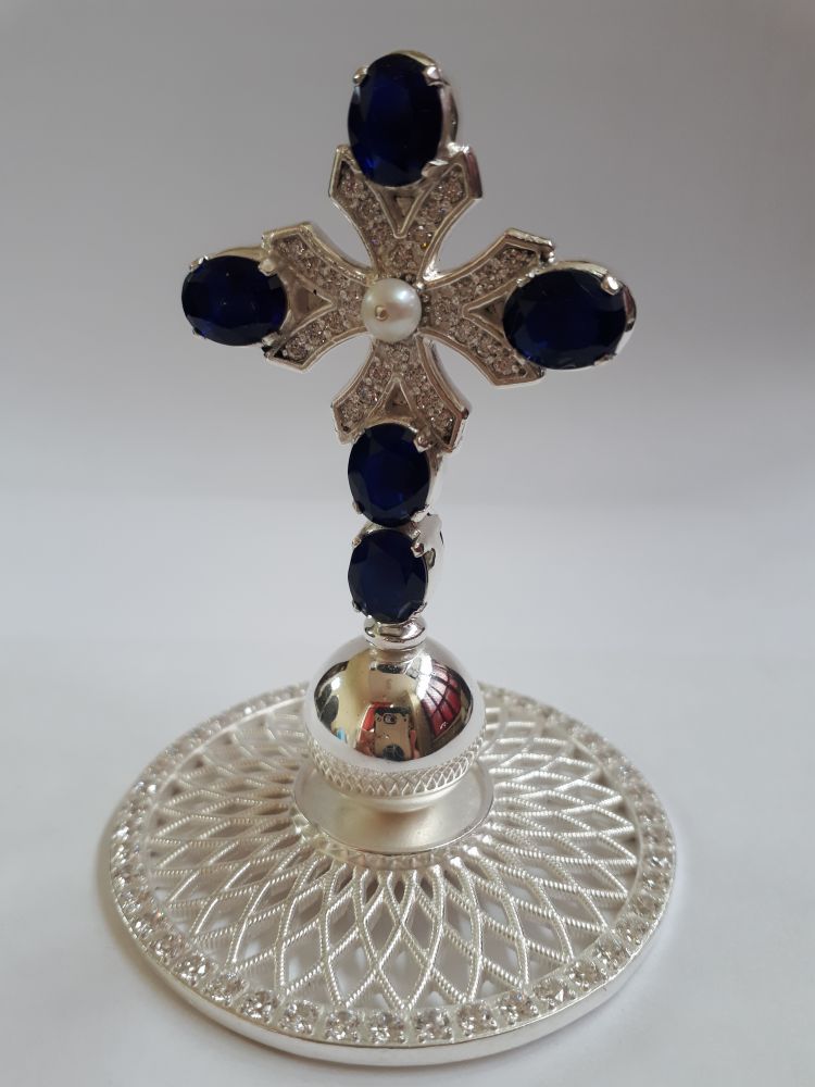 Крест на митру. Серебреная латунь. Камни – цирконий. Возможно изменение цвета камней и замена серебрения на золочение.