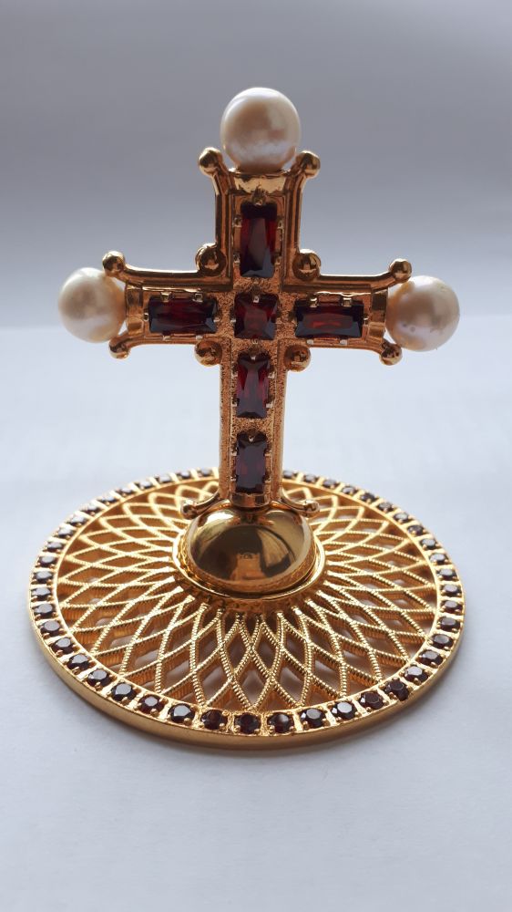 Хрест на митру. Позолочена латунь. Камені – цирконій. Натуральні перли. Можлива зміна кольору каміння. Заміна позолочення на посріблення.