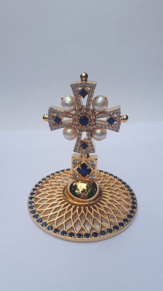 Крест на митру. Золочёная латунь. Камни – цирконий. Натуральный жемчуг. Возможно изменение цвета камней и замена золочения на серебрение.