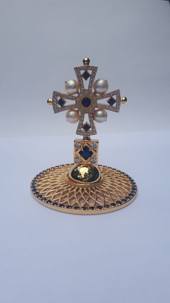 Хрест на митру. Позолочена латунь. Камені – цирконій. Натуральні перли. Можлива зміна кольору каміння та заміна позолоти на посріблення.
