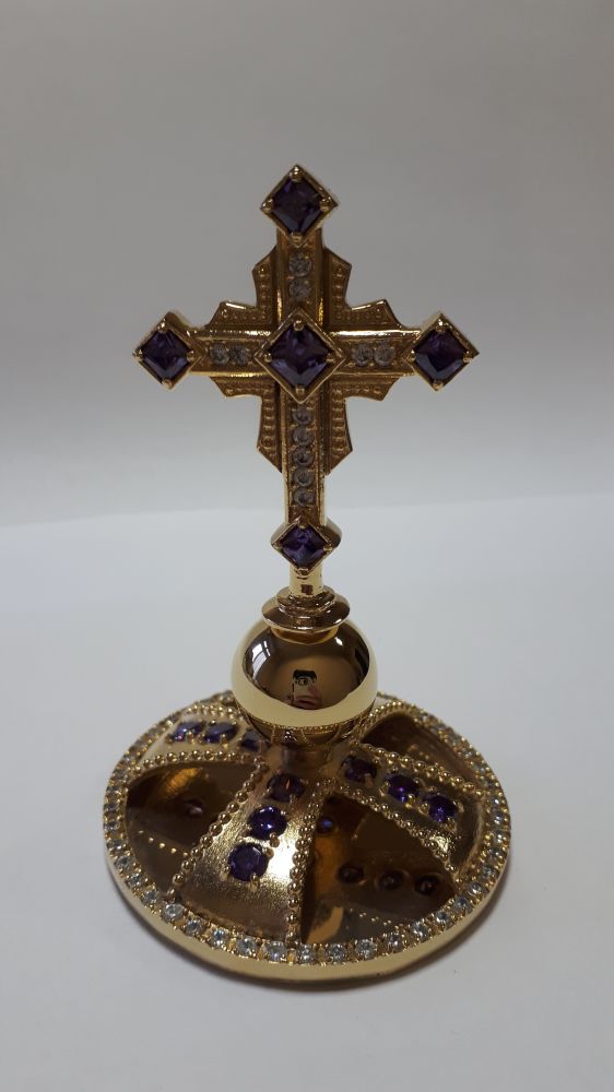 Крест на митру. Золочёная латунь. Камни – цирконий. Возможно изменение цвета камней и замена золочения на серебрение.