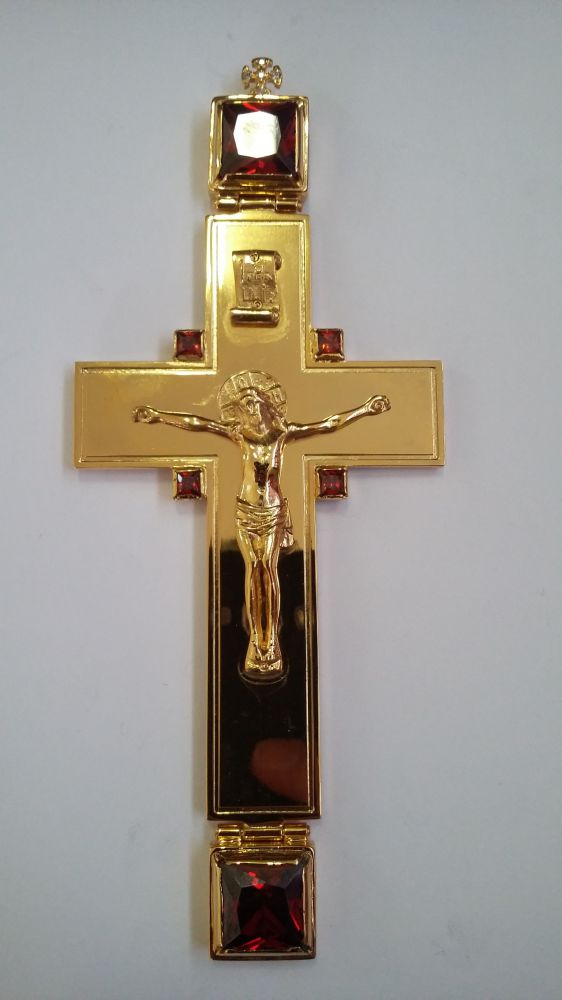 Хрест нагородний. Лите розп'яття. Розміри: 140х60 мм. Вага: 65 г. Позолочена латунь. Камені – цирконій. Ланцюг та футляр у комплекті. Можлива зміна кольору каміння, виготовлення хреста у сріблі.