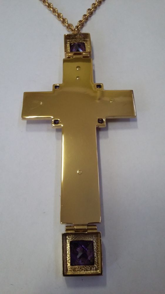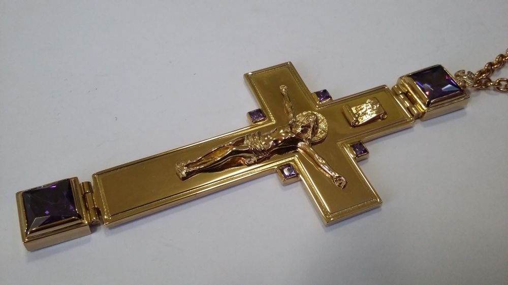 Крест наградной. Литое распятие. Размеры: 140х60 мм. Вес: 65 г. Золоченая латунь. Камни - цирконий. Цепь и футляр в комплекте. Возможно изменение цвета камней, изготовление креста в серебре.Крест наградной.