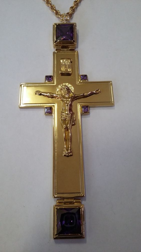Хрест нагородний. Лите розп'яття. Розміри: 140х60 мм. Вага: 65 г. Позолочена латунь. Камені – цирконій. Ланцюг та футляр у комплекті. Можлива зміна кольору каміння, виготовлення хреста у сріблі.