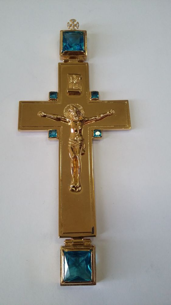 Хрест нагородний. Лите розп'яття. Розміри: 140х60 мм. Вага: 65 г. Позолочена латунь. Камені – цирконій. Ланцюг та футляр у комплекті. Можлива зміна кольору каміння, виготовлення хреста у сріблі.
