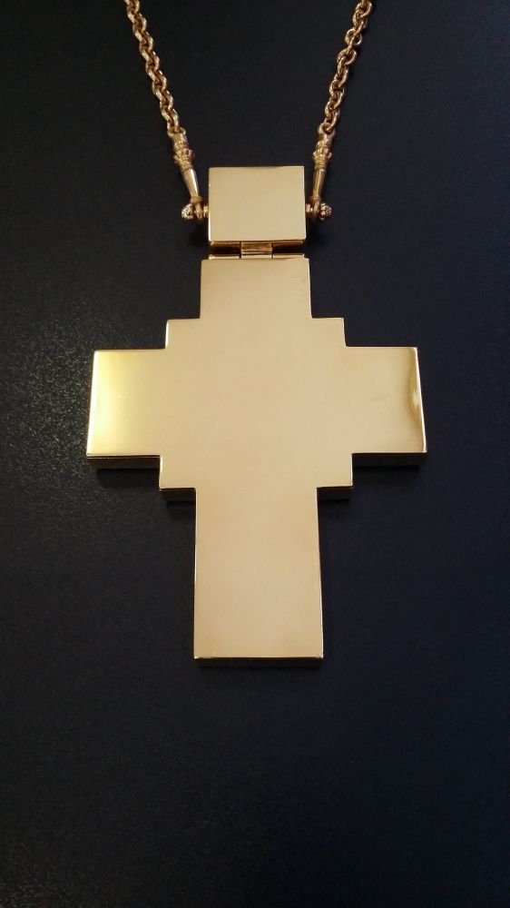 Крест наградной. Литое распятие. Размеры: 140х70 мм. Вес: 140 г. Золоченая латунь. Камни - цирконий. Цепь и футляр в комплекте. Возможно изменение цвета камней, изготовление креста в серебре.