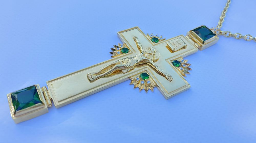 Крест наградной. Литое распятие. Размеры: 140х60 мм. Вес: 65 г. Толщина латунной пластины 3 мм. Золоченая латунь. Камни - цирконий. Цепь и футляр в комплекте. Возможно изменение цвета камней, изготовление креста в серебре.
