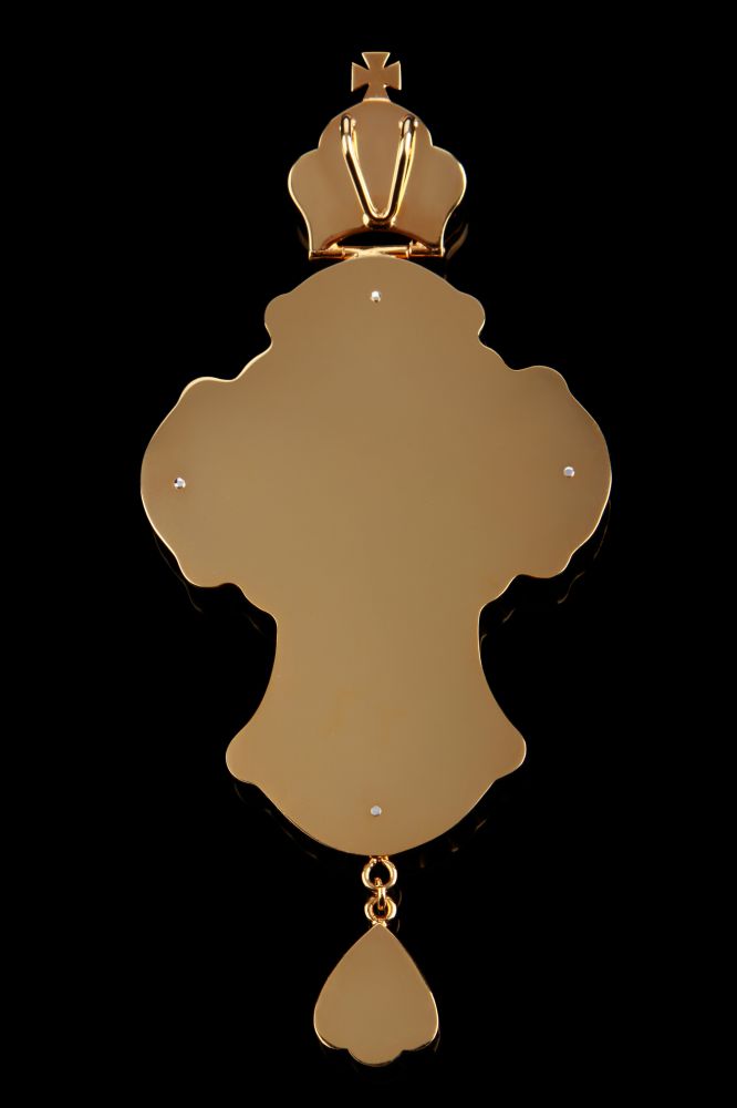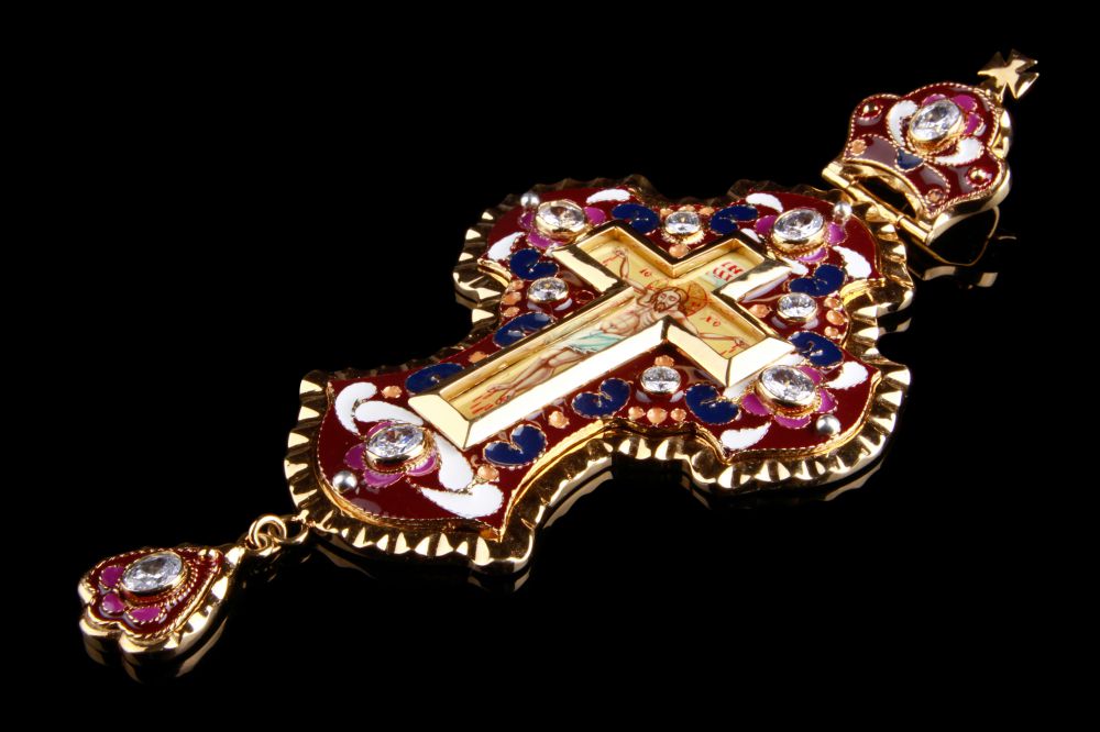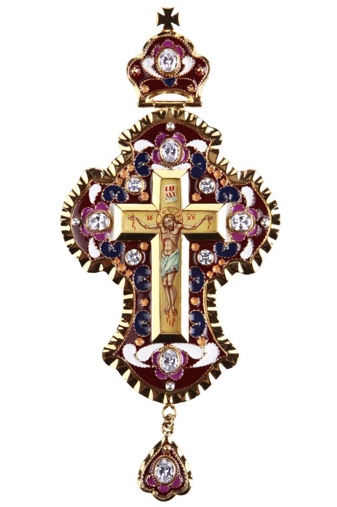 Хрест наперсний. Розп'яття – ручний розпис на перламутрі. Розміри: 165х75 мм. Вага: 147 г. Позолочена латунь. Холодна емаль. Лита філігрань. Камені – цирконій. Ланцюг та футляр у комплекті. Можлива зміна кольору каміння, малюнку, розмальовки емалі, виготовлення хреста у сріблі.