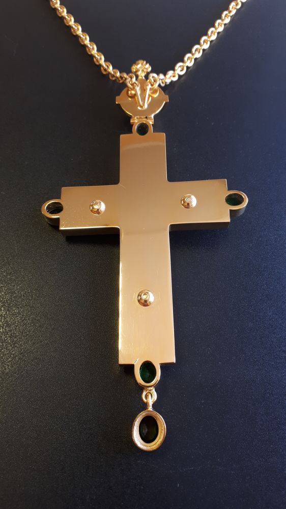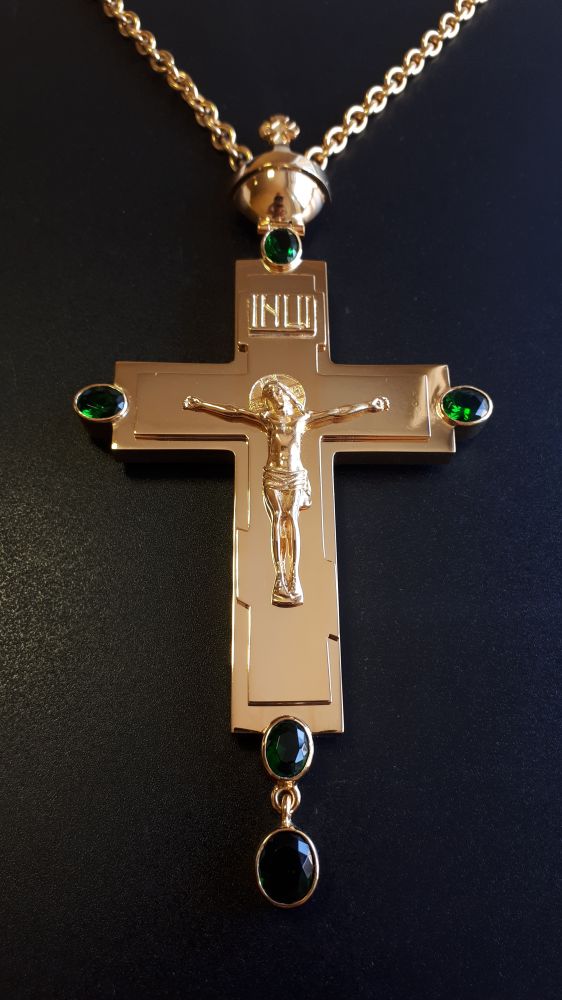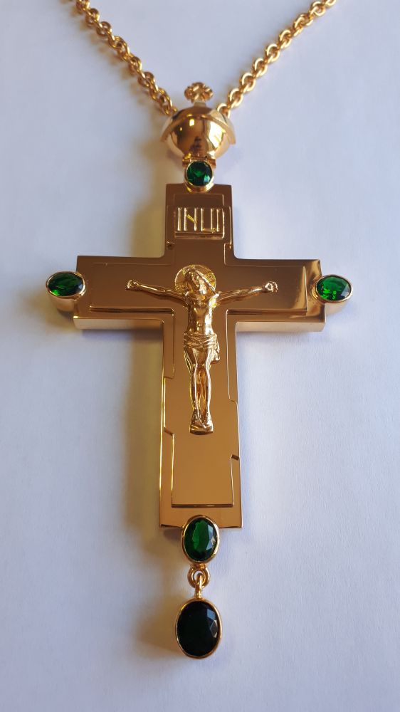 Хрест наперсний. Розміри: 160 х 80 мм. Вага: 114 г. Позолочена латунь. Камені – цирконій. Ланцюг та футляр у комплекті. Можлива зміна кольору каміння, виготовлення хреста у сріблі.