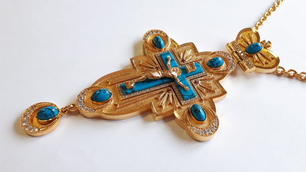 Хрест наперсний. Овальні кабошони та хрест під Розп'яттям з бірюзи. Розміри: 165 х 90 мм. Вага: 150 г. Позолочена латунь. Камені – цирконій. Ланцюг та футляр у комплекті. Можлива зміна кольору каміння, виготовлення хреста у сріблі.