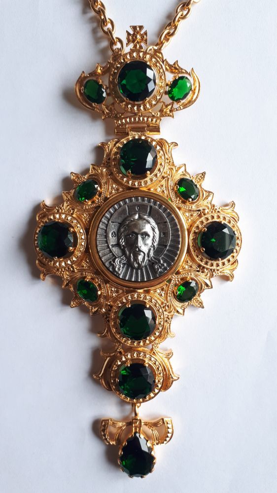 Крест наперсный. Литой лик: серебрение с чернением Размеры: 163х75 мм. Вес: 120 г. Золоченая латунь. Камни - цирконий. Цепь и футляр в комплекте. Возможно изменение цвета камней, изготовление креста в серебре.