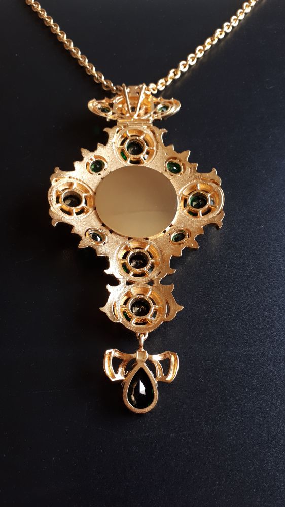 Хрест наперсний. Литий лик: срібло з чорнінням Розміри: 163х75 мм. Вага: 120 г. Позолочена латунь. Камені – цирконій. Ланцюг та футляр у комплекті. Можлива зміна кольору каміння, виготовлення хреста у сріблі.