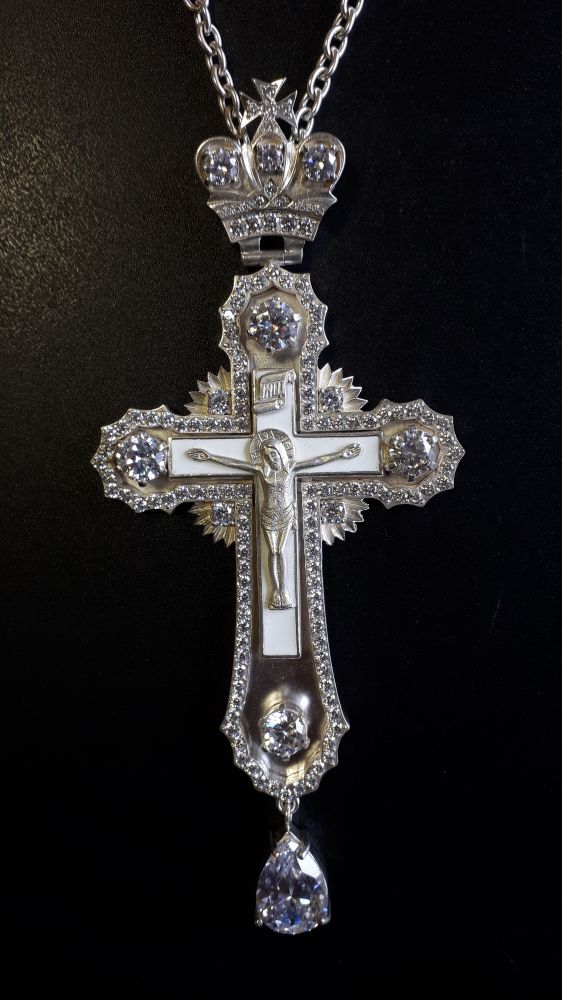 Хрест наперсний. Лите розп'яття. Біла емаль (відтінок слонової кістки). Розміри: 158х65 мм. Вага: 71 г. Посріблена латунь. Камені – цирконій. Ланцюг та футляр у комплекті. Можлива зміна кольору каміння, емалі, виготовлення хреста у сріблі.