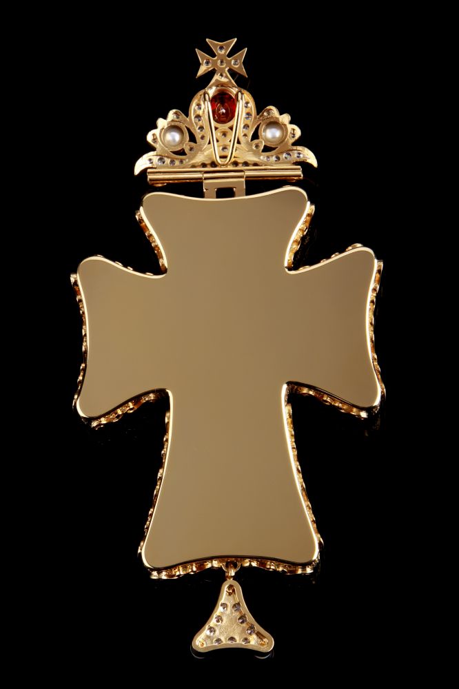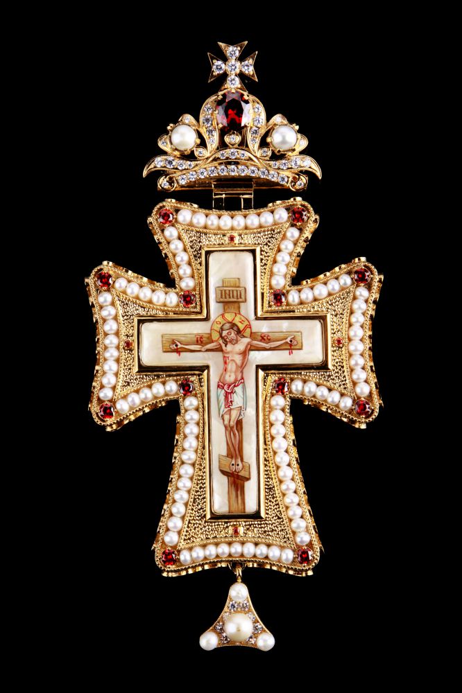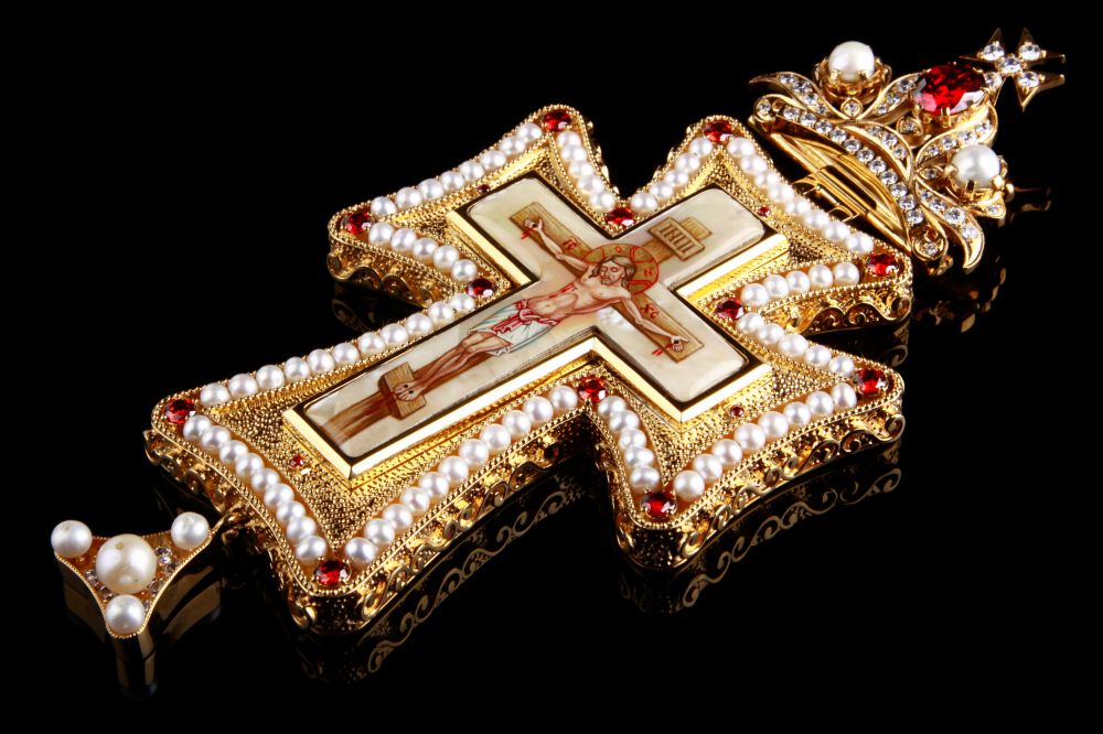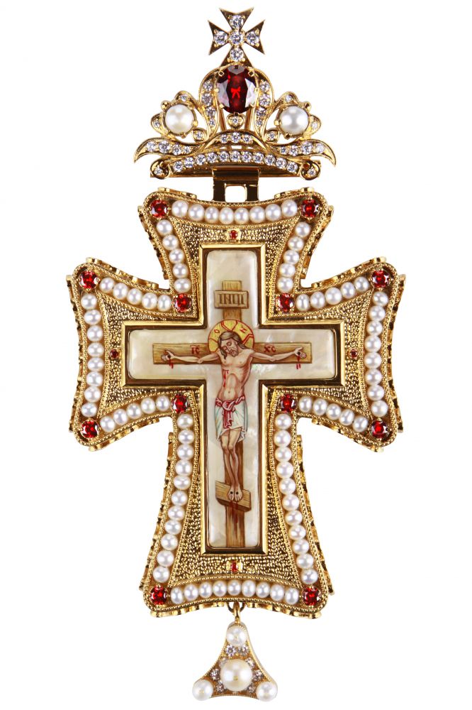 Хрест наперсний. Розп'яття – ручний розпис на перламутрі. Розміри: 175х85 мм. Вага: 196 г. Позолочена латунь, перли. Камені – цирконій. Ланцюг та футляр у комплекті. Можлива зміна кольору каміння, малюнка, виготовлення хреста у сріблі.
