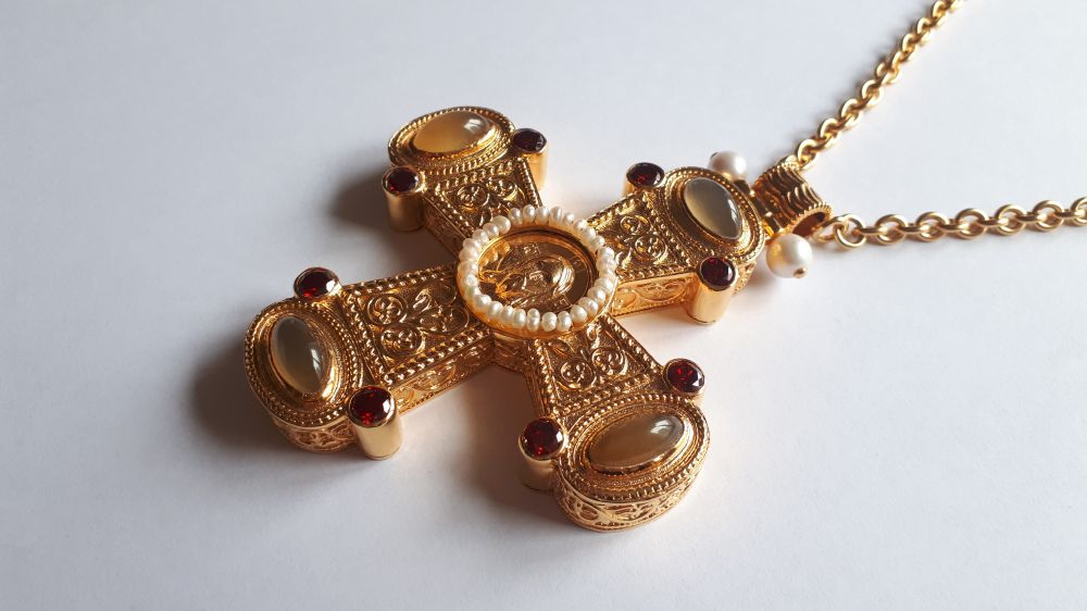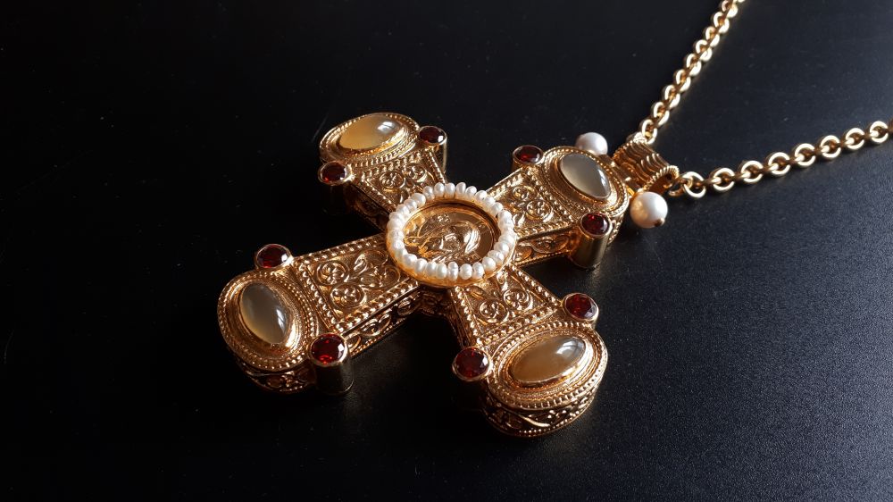 Крест наперсный. Литой лик, натуральный жемчуг. Размеры: 100х82 мм. Вес: 132 г. Золоченая латунь. Камни - натуральный сердолик и цирконий. Цепь и футляр в комплекте. Возможно изменение цвета камней, изготовление креста в серебре.