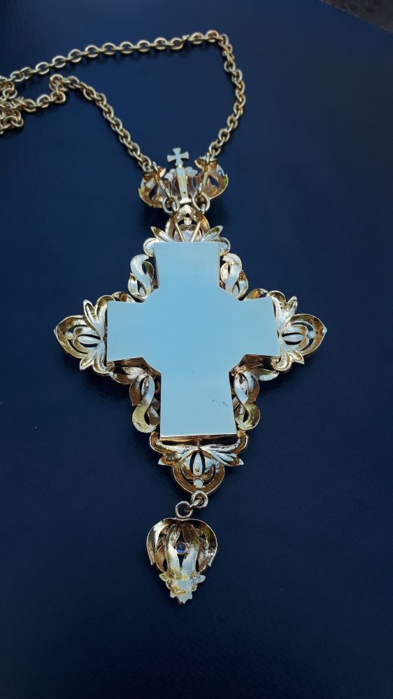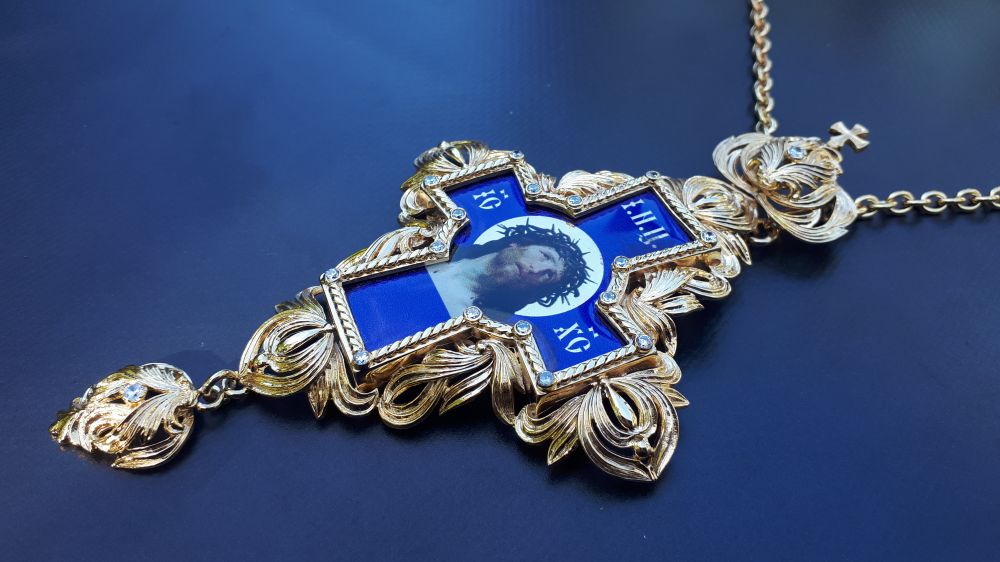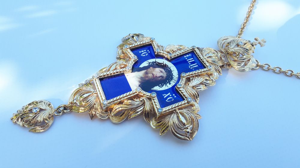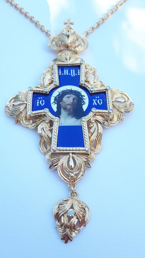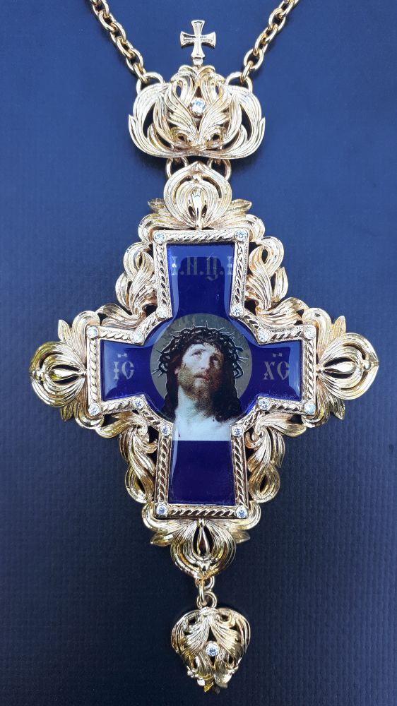 Крест наперсный с литографией Лик - качественная печать. Материал нимба - золотистая фольга. Размеры: 150х80 мм. Вес: 88 г. Золоченая латунь. Камни - цирконий. Цепь и футляр в комплекте. Возможно изменение цвета камней.
